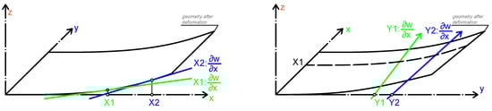 The plate curvature parameters and describe the change in slope of the bending plate in the x and y directions, respectively. The parameter describes the change in slope in the x direction along the y axis. The plate curvature parameters are illustrated in Figure 4.