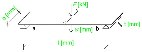 Schematic of the three-point bending test setup. The parameter l is the span between the supports, b is the width of the plate, t is the thickness of the plate represented as the sum of three layers (6/7/6 mm), F is the applied force measured by the testing machine at the point of application, and w is the deflection measured at the midpoint where the force is applied. In the figure, “a” indicates the location of the support rollers, and “b” denotes the point of force application.