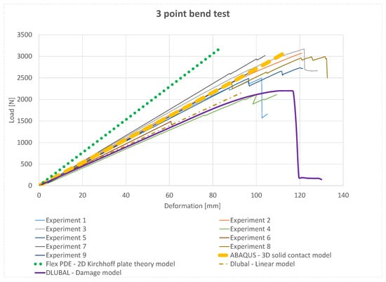 The experimental results, the bending response obtained from the plate model based on the classical laminate theory in FlexPDE, the Dlubal model with linear material properties or incorporating the damage model, and the 3D solid model in Abaqus for three-point bending are presented in Figure 9.