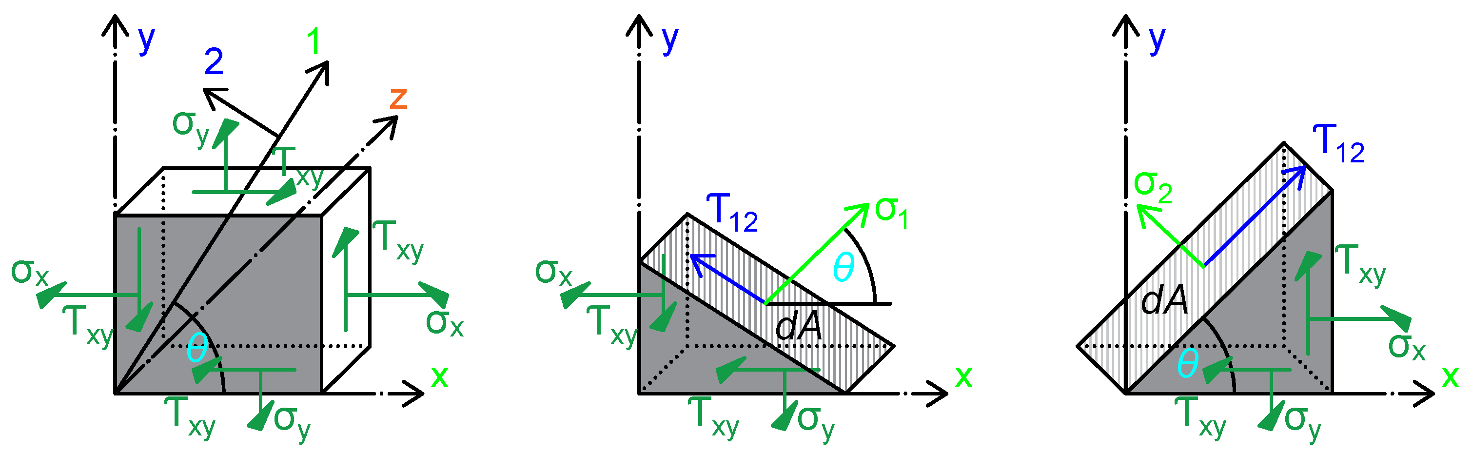 σ 1 = σ x cos 2 θ + σ y sin 2 θ + 2 τ x y sin θ cos θ σ 2 = σ x sin 2 θ + σ y cos 2 θ 2 τ x y sin θ cos θ τ 12 = ( σ x + σ y ) sin θ cos θ + τ x y ( cos 2 θ sin 2 θ )