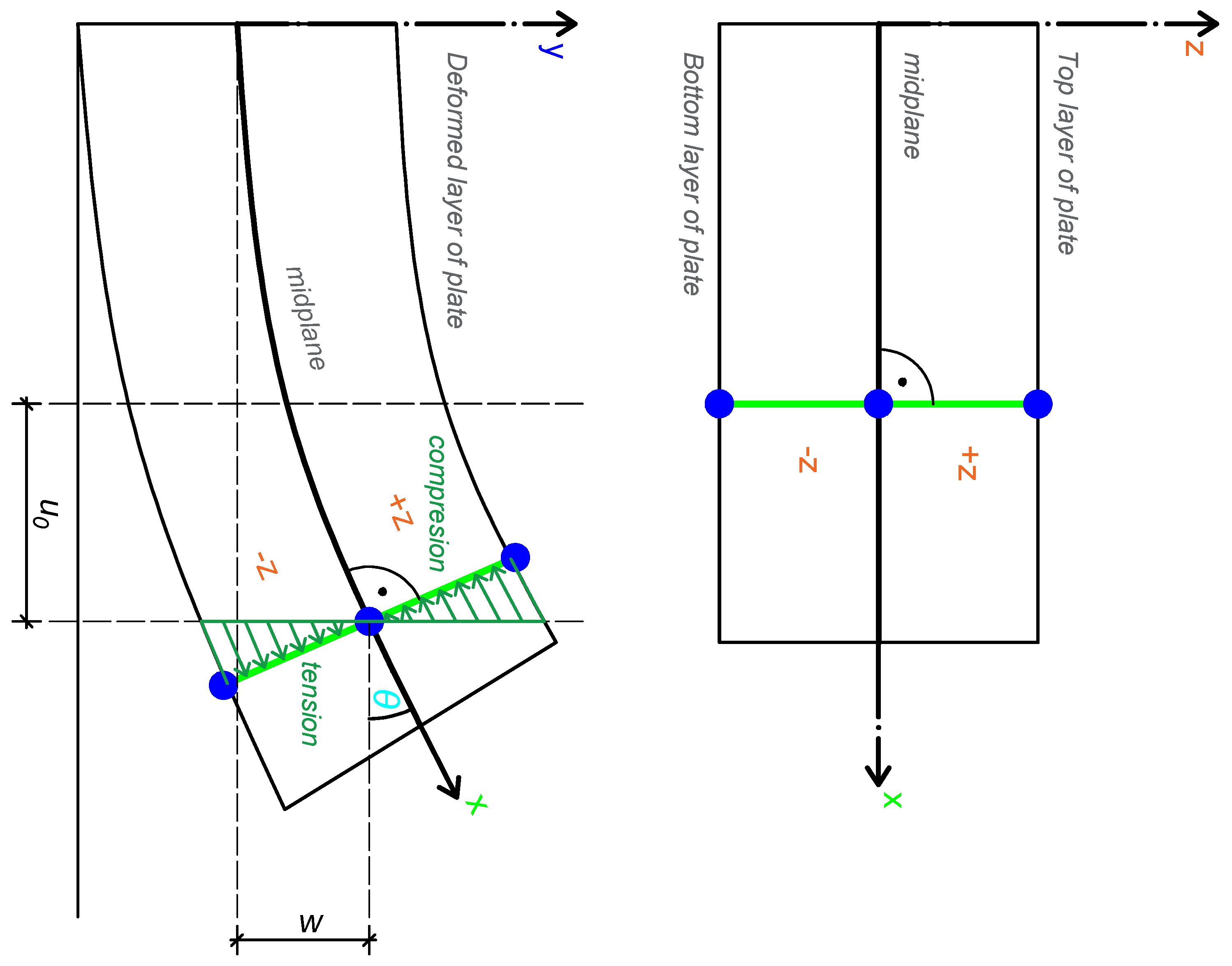 Figure 3. Total plate displacements schematic. The z-direction displacement due to bending is sin θ times z. Under the condition sin θ 0 , θ is a small angle and the displacement is z for negative θ (compression) and + z for positive θ (tension) [13].