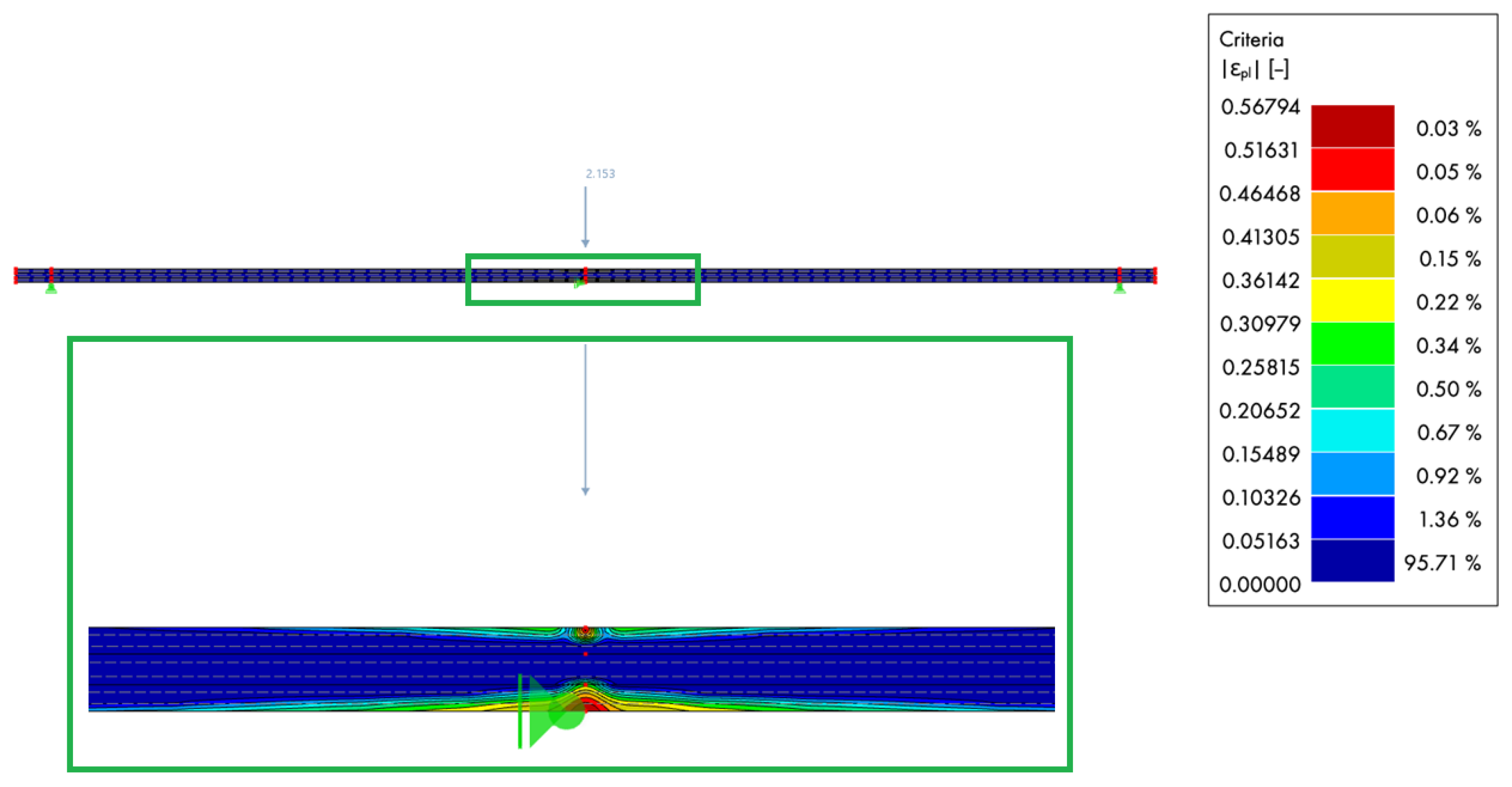 Figure 10. Damage of the beam in the longitudinal x direction during the three-point bending test with a line load of 2153 kN at the beginning of loading.