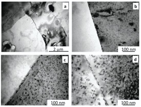 TEM pictures of (a) as received containing 0.4 wt% Si, (b) irradiated 2.73 × 1026 n/m2, E > 0.625 eV, Si content 0.68 wt% (c) 3.76 × 1026 n/m2, Si content 0.88 wt%, (d) 9.81 × 1026 n/m2, Si content 2.21 wt% [].
