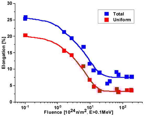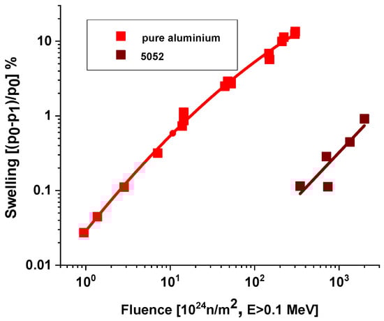 Several research reactors have been built from 5xxx or 6xxx type aluminum and operated for a long time. Some parts survived fast and thermal neutron flux up to 1026 n/m2 or even beyond without failure (e.g., FRJ2, HANARO, HIFAR, BR2, LVR15, HFRs, etc. [,,,,,]). Figure 5 shows the effect of high fluence on the 5052 type alloy [,].