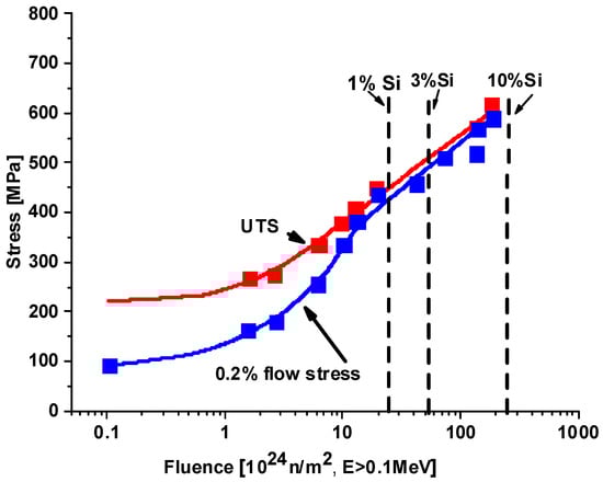 Throughout the lifetime of RRs, these materials are exposed to large thermal neutron fluence values (in some cases even up to ~1027 n/m2) []. Substantial damage to the material’s microstructure and mechanical properties can occur at these high fluence conditions, primarily due to the transmutation of aluminum into silicon by thermal neutrons and displacement damage due to fast neutrons [,].