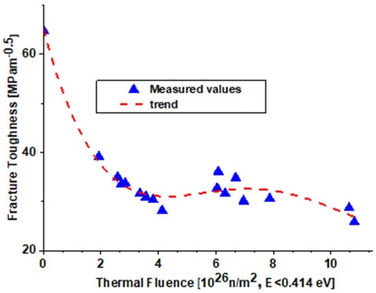 The reconstructed HFR is also built from the AlMg3.5 (5154-0) alloy. The reactor has a detailed surveillance program. One-inch CT specimens were irradiated and tested at room temperature, and valid J1c or K1c values were obtained [,]. Fracture toughness test results as a function of calculated thermal neutron fluence (E < 0.414 MeV) values for each tested surveillance specimen are presented in Figure 11. The fracture toughness of the unirradiated 5154-O aluminum alloy is calculated from valid J1c data in accordance with the ESIS P2-92 procedure (J-R curve multiple specimen test approach). The irradiated fracture toughness data (KIC) presented in Figure 11 are measured and give valid results in accordance with ASTM E399-08 [].