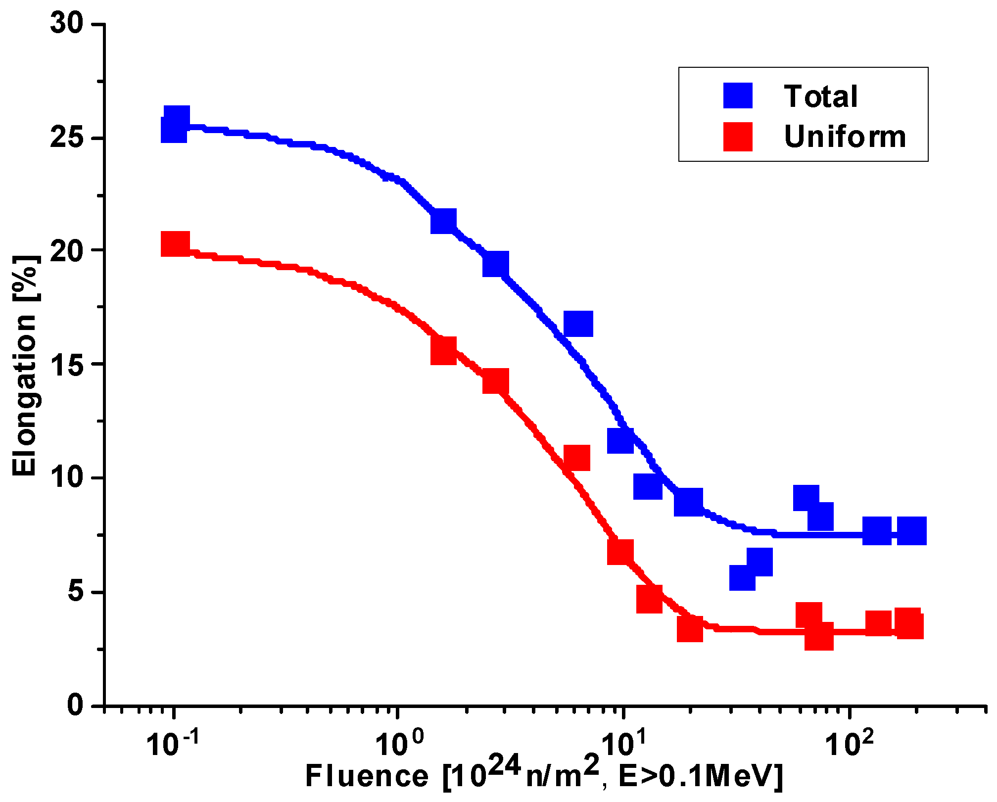 2 fluence with a 0.2% uniform elongation and about 1.3% total elongation (see