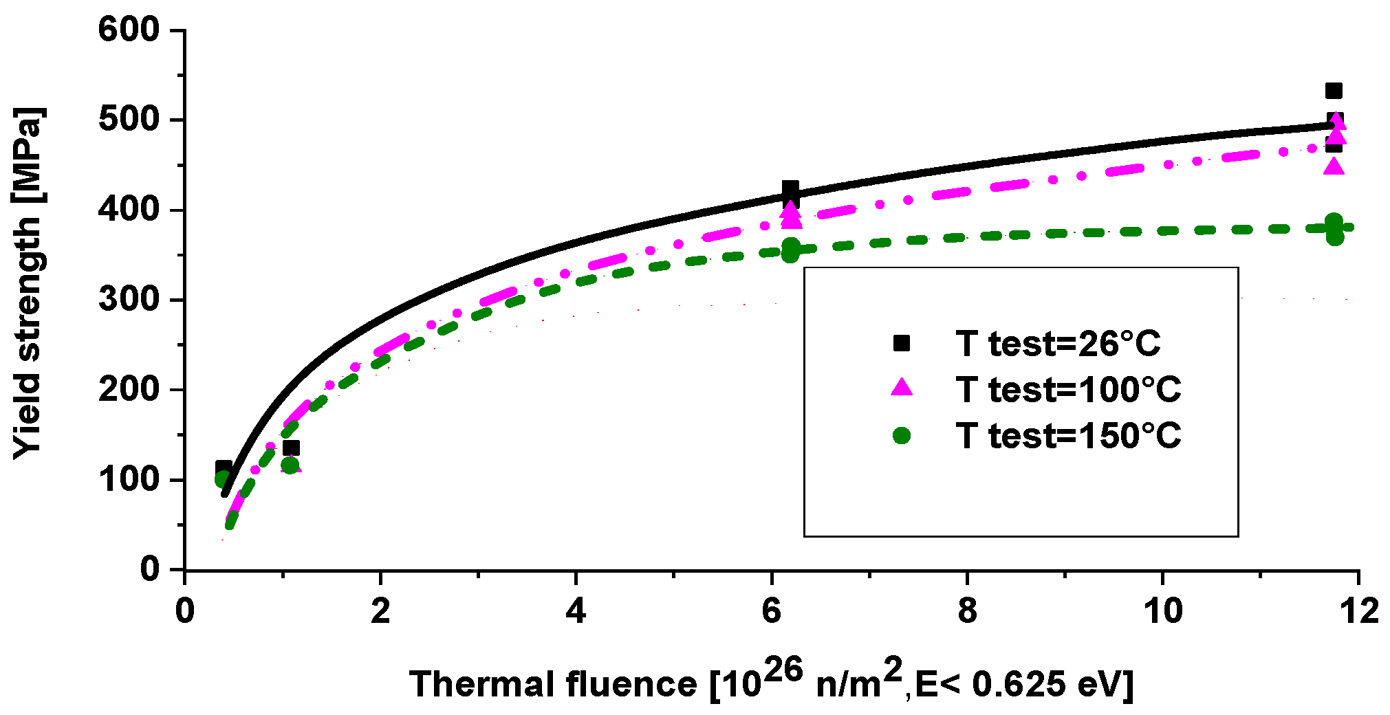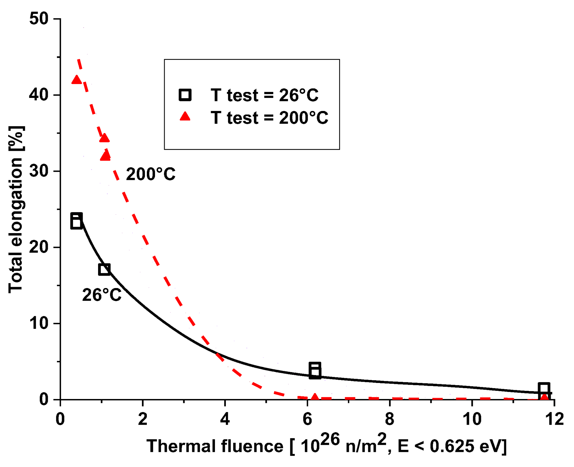 Figure 9 show that some ductility remains at high thermal fluence values if the test is performed at room temperature. At elevated temperatures, the degree of precipitation hardening is expected to be high due to increased mobility, resulting in lower ductility. At room temperature, Mg