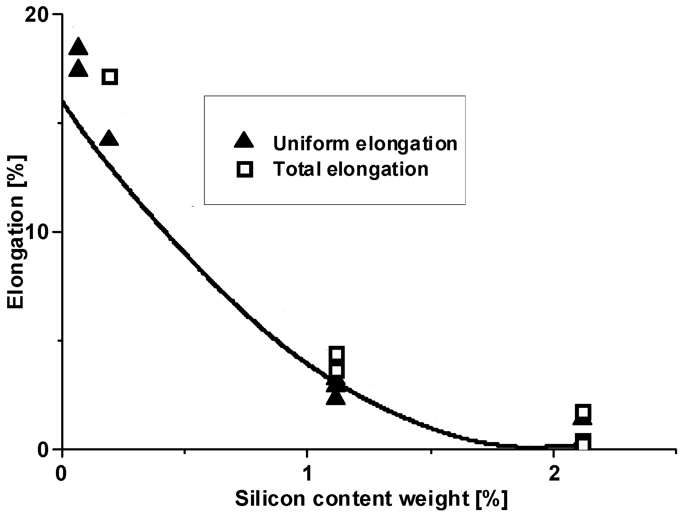 Figure 10). At 1.75% silicon content, ductility became zero. However, considering measured points, still 1–2% elongation can be predicted up to 2.5% silicon content. Moreover, the 5754 alloy contains about 3% Mg, so all Mg content is solved into Mg