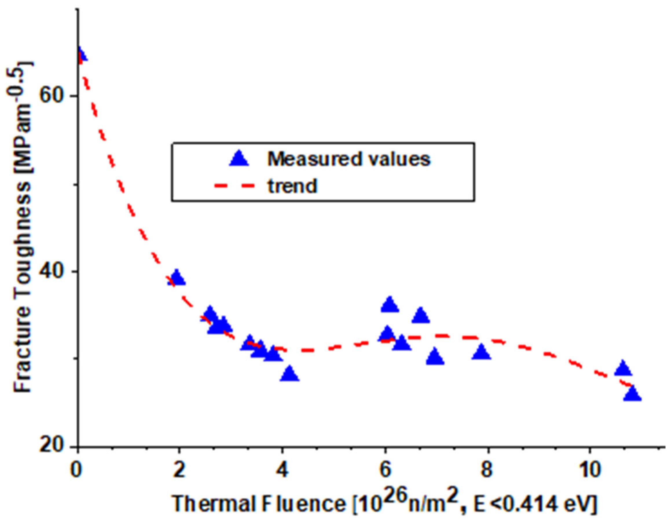 9]. However, there is a limited understanding of the materials’ degradation mechanisms and insufficient material data (specifically fracture toughness data) are available for high fluence values. In the literature, indications of an abrupt transition towards brittle behavior at higher fluences were found [