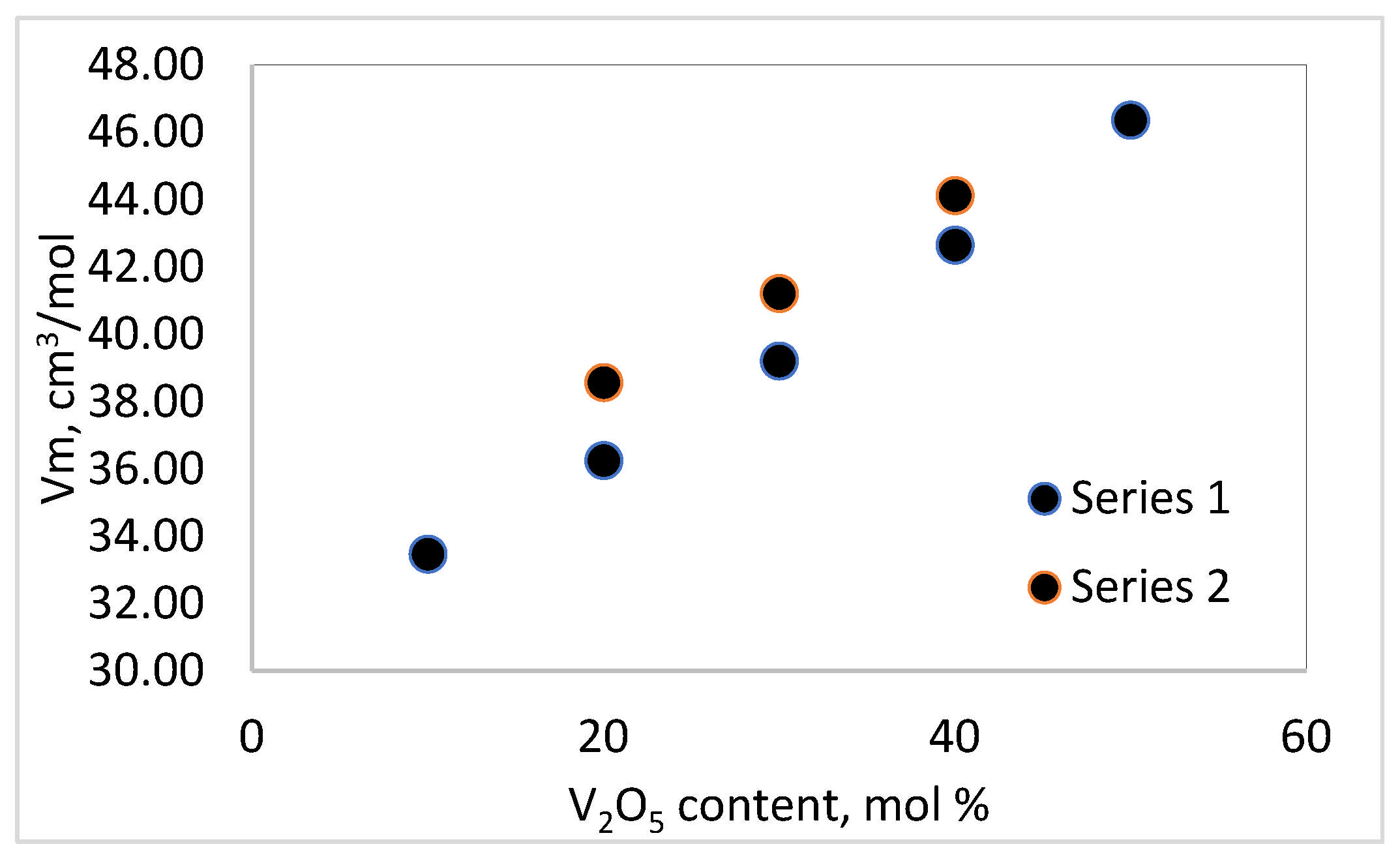 For glasses with a content of V2O5 up to 40 mol%, the dominant glass-forming agent is TeO2, and above 40 mol %, the dominant glass-forming agent is V2O5.