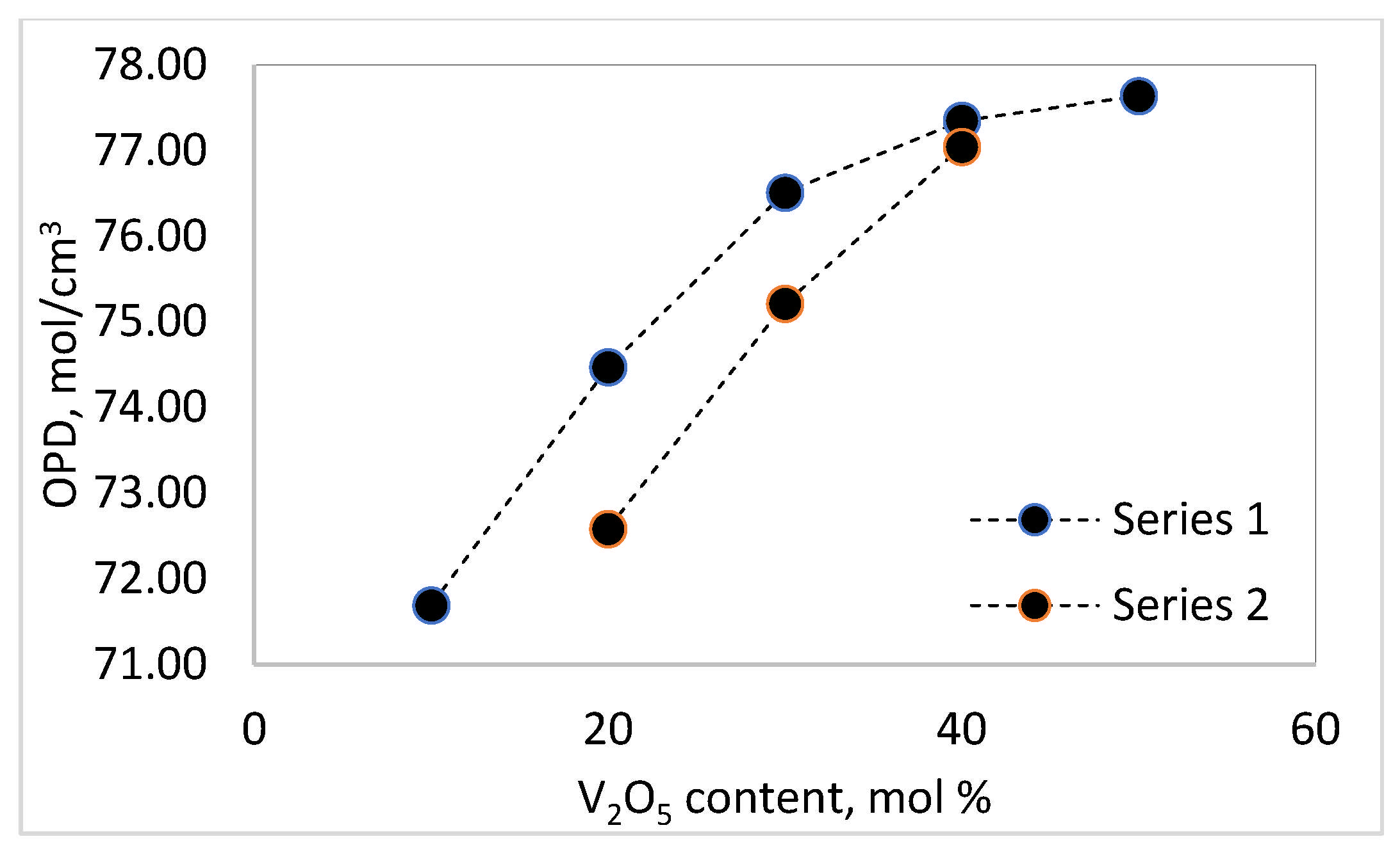 m, expresses the free space and formation of non-bridging oxygens (NBOs) in the glass structure, while the oxygen packet density (OPD) is sensitive to the tightness of the structure as a whole. An increase in molar volume implies an increase in free space and the formation of non-bridging oxygens (NBOs) in the glass structure, and an increase in oxygen packet density is due to the formation of a stronger and highly cross-linked network, resulting in a more tightly packed amorphous network [