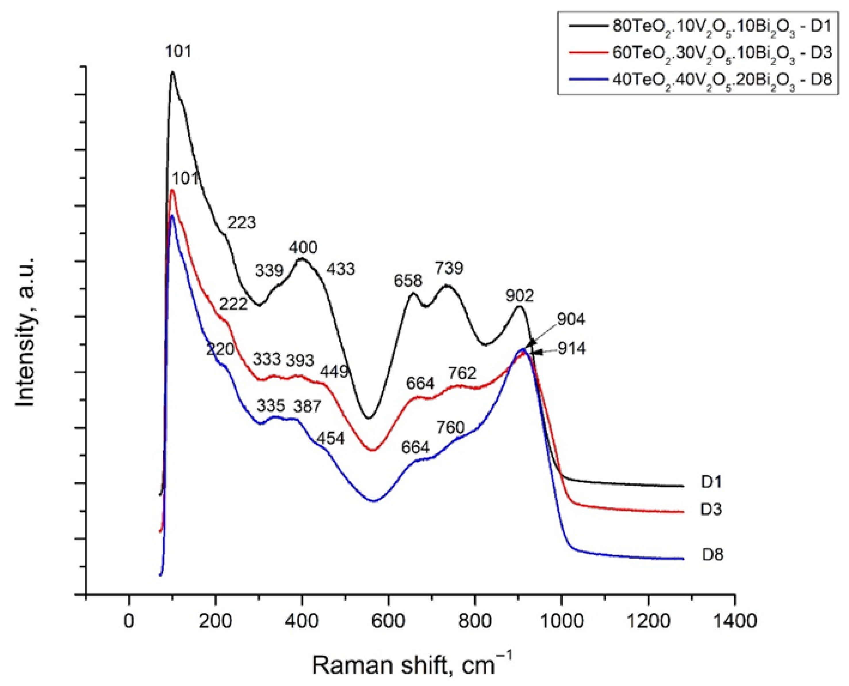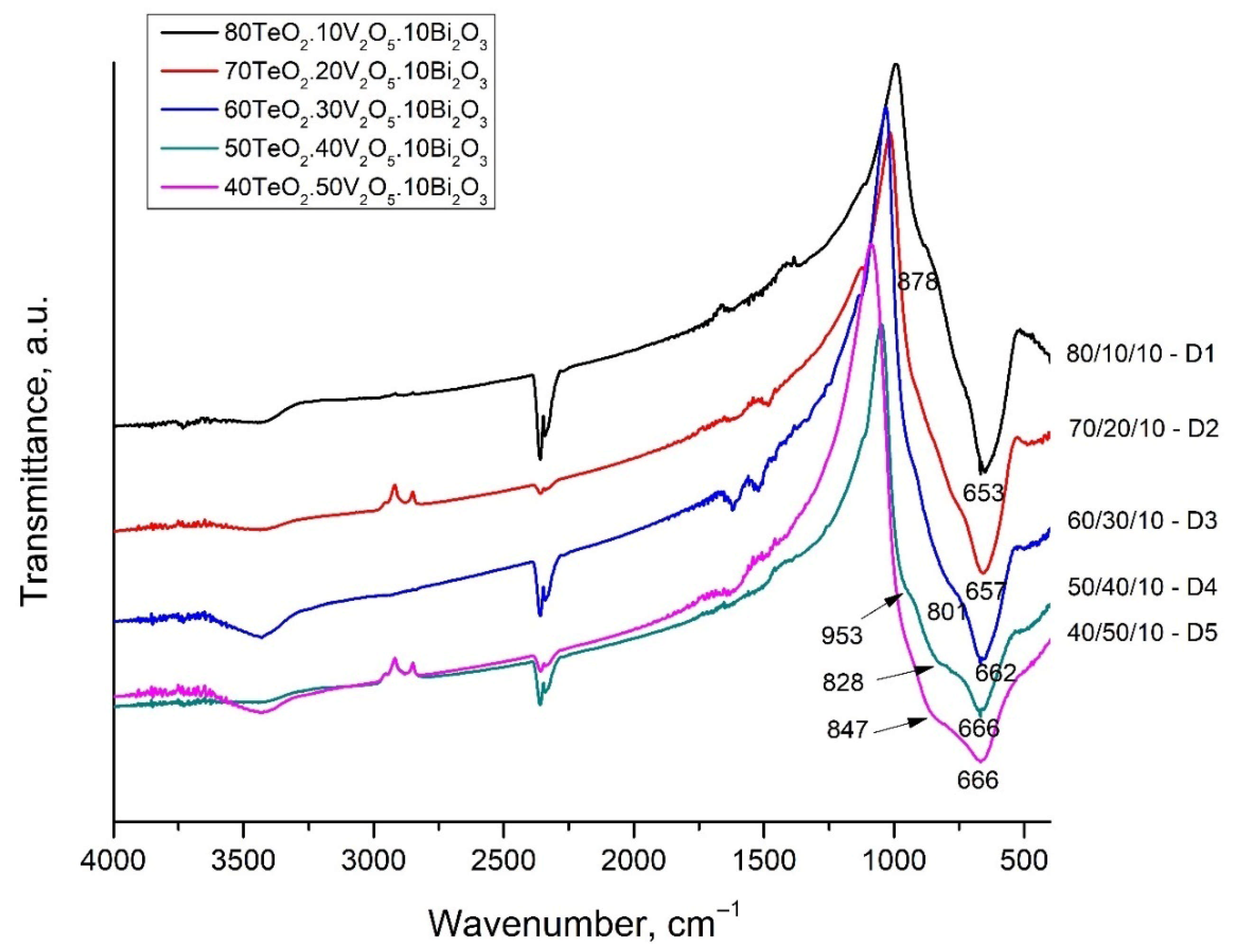 In the spectrum of glass with a composition of 80TeO2.10V2O5.10Bi2O3—D1, this band is strongly pronounced and even more intense than the strip at 660 cm−1 (TeO4 trigonal bipyramids). With an increase in the content of V2O5, the weak, elongated bond of the TeO3+1 polyhedra breaks and isolated TeO3 trigonal pyramids are formed and the position of the band shifts to about 760 cm−1. The intensity of all stripes associated with the vibrations of tellurite polyhedra and bonds decreases with increasing V2O5 content.
