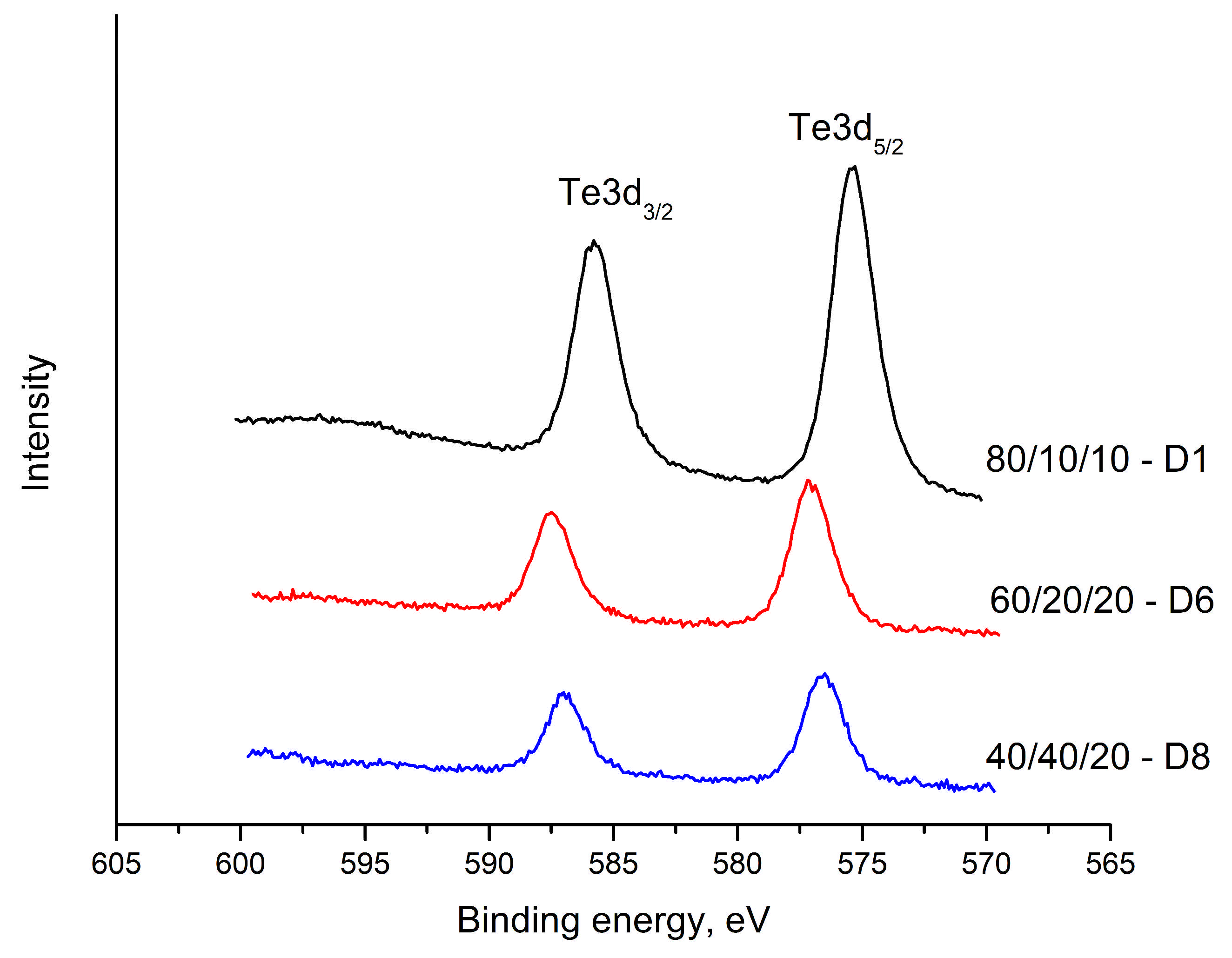 Figure 6 shows the electron spectra in the region of 600–570 eV. This area includes the doublets attributed to the Te 3d