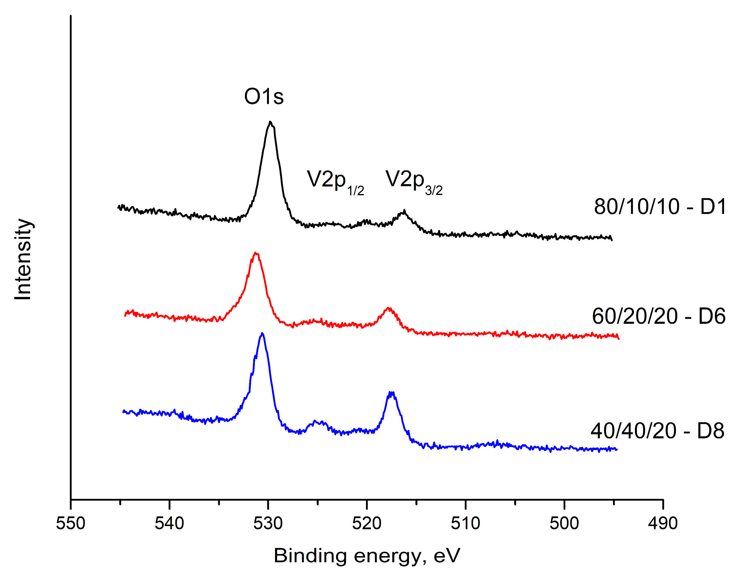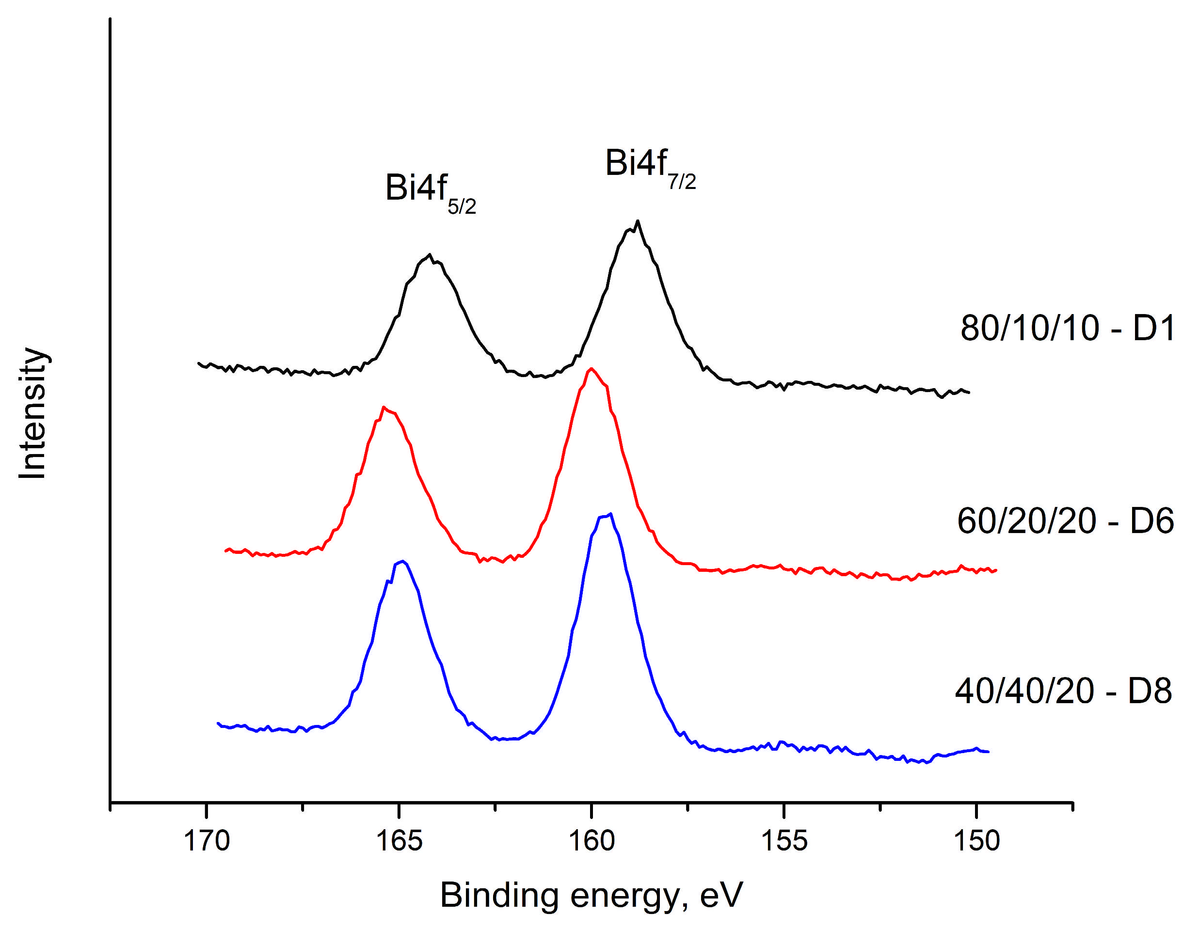 In the region of 230–240 eV, Bi 4f spin-orbital cleavage is observed, as well as chemical displacement of the binding energies, from 159.69–158.87 eV to Bi 4f7/2 and from 164.22–164.95eV to Bi 4f5/2, with an energy difference of 4.53eV to 6.08eV, respectively. The intensity of the peaks decreases with an increase in the content of V