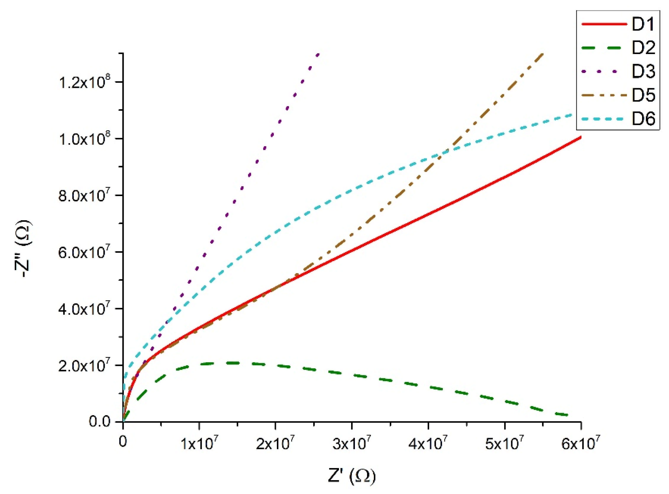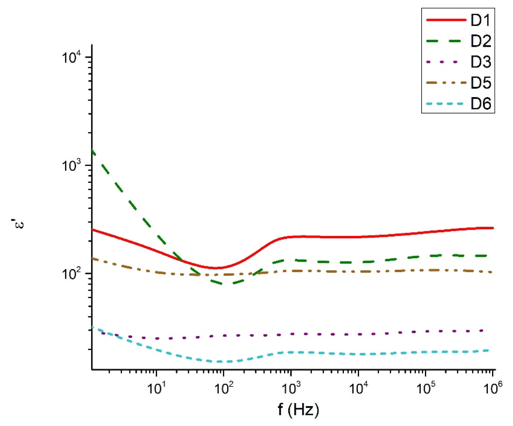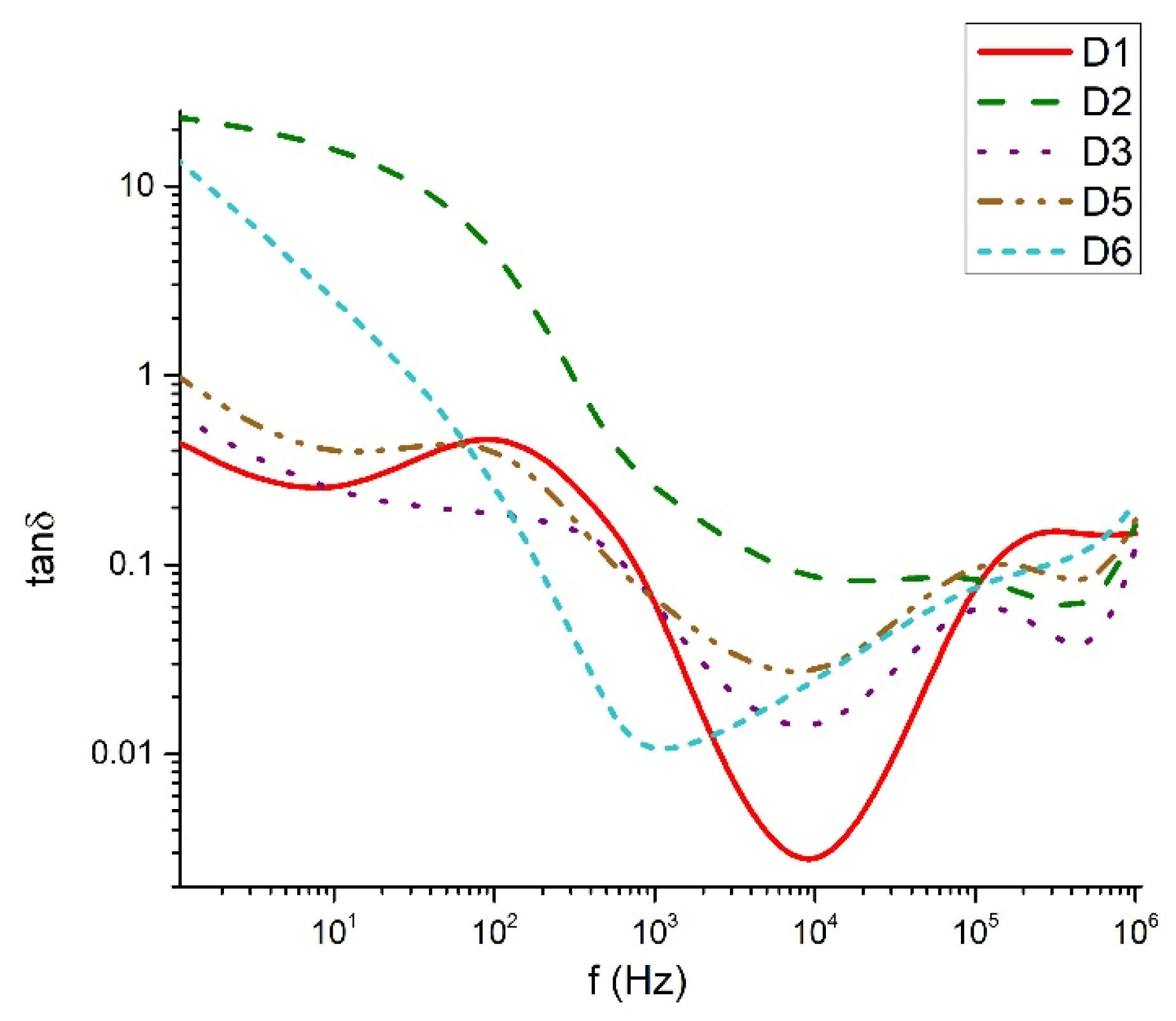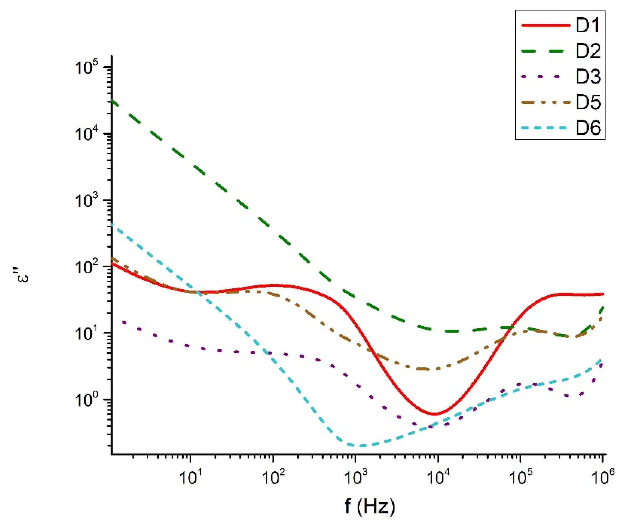 The dielectric behavior of the studied tellurite–vanadate–bismuth glasses is closely linked to their structural features. Most samples exhibit similar real permittivity (~3.102) across the measured frequency range, reflecting the dominant role of the tellurite network in establishing the base dielectric response. However, the compositions 60TeO2-30V2O5-10Bi2O3 (D3) and 50TeO2-40V2O5-10Bi2O3 (D4) show elevated permittivity values at low frequencies (<10 Hz). This enhancement is associated with the presence of highly polarized TeO3+1 units and VO4 tetrahedra, which may generate localized regions of uncompensated charges and contribute to increased dielectric losses. At high frequencies (>1 kHz), all samples exhibit a steady decrease in dielectric losses, remaining below 0.3. This behavior reflects the inability of large, highly polarizable structural units, such as TeO4 and TeO3+1 polyhedra, to follow rapid field oscillations, leading to reduced polarization and lower energy dissipation. In the intermediate frequency range (100 Hz–1 kHz), samples 60TeO2-30V2O5-10Bi2O3 (D3) and 60TeO2-20V2O5-20Bi2O3 (D6) show pronounced dielectric losses, indicating strong relaxation processes arising from structural heterogeneities, such as elongated Te–O bonds in TeO3+1 units and V–O–V linkages in VO4 tetrahedra. The variation in dielectric response can be rationalized in terms of network connectivity and polarizability. Glasses with higher V2O5 content (>40 mol%) form more symmetric TeO4 bipyramids and VO4 tetrahedra, increasing network rigidity and reducing the contribution of weakly bonded TeO3+1 units to low-frequency dielectric dispersion. In contrast, glasses with significant TeO3+1 populations (e.g., D1, D5) display reduced dielectric losses and more stable real permittivity due to the formation of isolated TeO3 trigonal pyramids, which limit charge accumulation and local polarization effects. The electrical conductivity data further support the structural interpretation. Conductivity remains negligible in the 100–2 × 104 Hz range, consistent with the insulating nature of the cross-linked tellurite-vanadate network. Beyond this frequency, a sharp increase in conductivity occurs, reflecting the frequency-dependent polarization of TeOn and VOn units and the activation of localized charge transport associated with NBOs. Thus, the dielectric properties of these glasses are strongly governed by the interplay between structural units (TeO4, TeO3+1, VO4), network connectivity, and non-bridging oxygens. Tailoring the relative contents of TeO2, V2O5, and Bi2O3 allows for precise control over the polarization mechanisms, dielectric losses, and permittivity, providing a clear structural rationale for the observed frequency-dependent behavior.