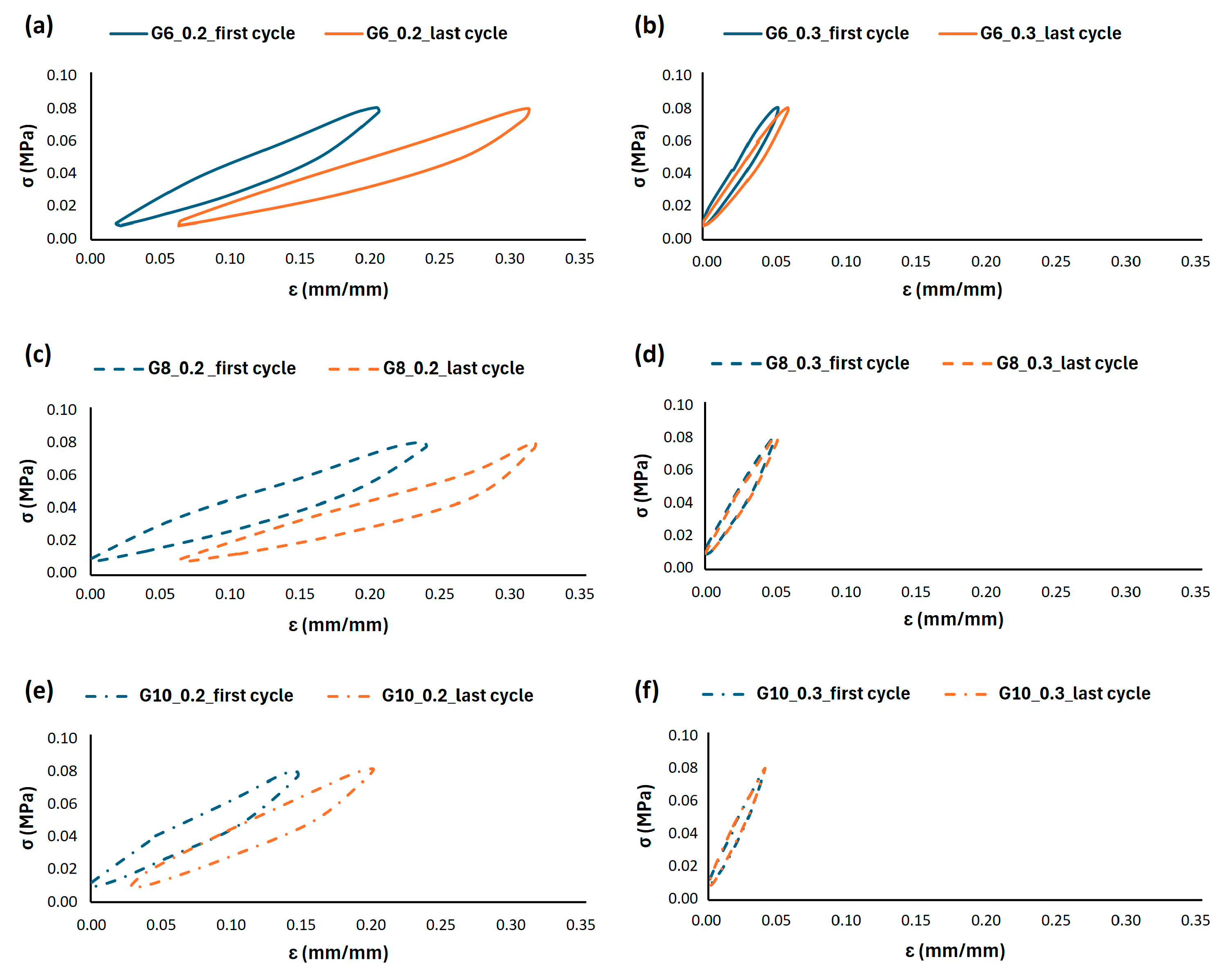 - G8_0.3 offers an optimal balance. It combines adequate compliance (for comfort) with exceptional fatigue resistance and energy dissipation, as evidenced by its stable hysteretic response and low permanent deformation. This configuration effectively mitigates cyclic softening while maintaining the elastic recovery necessary for long-term use in rehabilitation cycling.