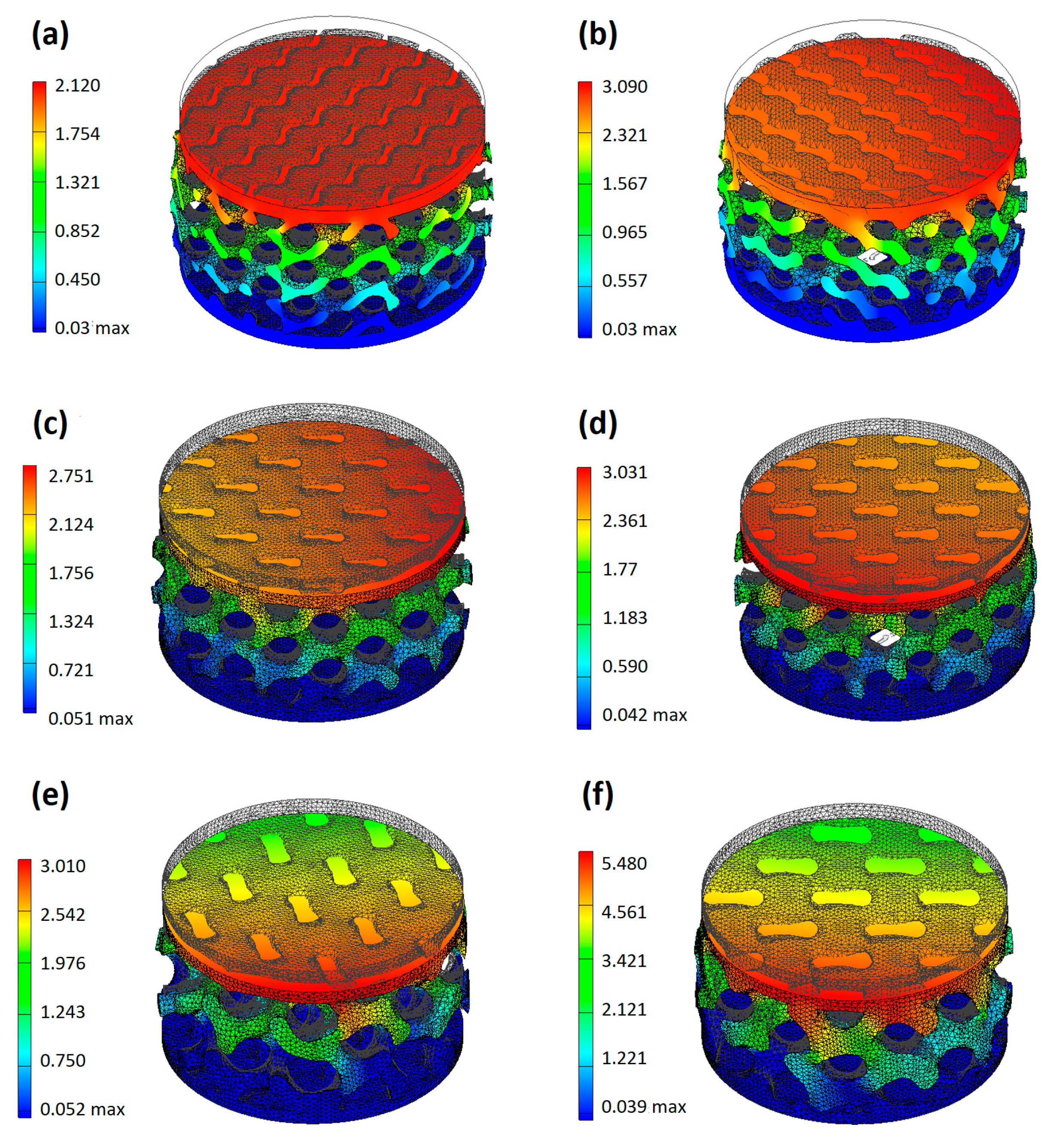 - Cell size modulates stiffness and stress distribution. Larger cell sizes (10 mm) enhance compliance and reduce stress concentrations, leading to improved fatigue life. Smaller cells (6 mm) increase stiffness but are more susceptible to stress localization and damage accumulation if not coupled with sufficient density.