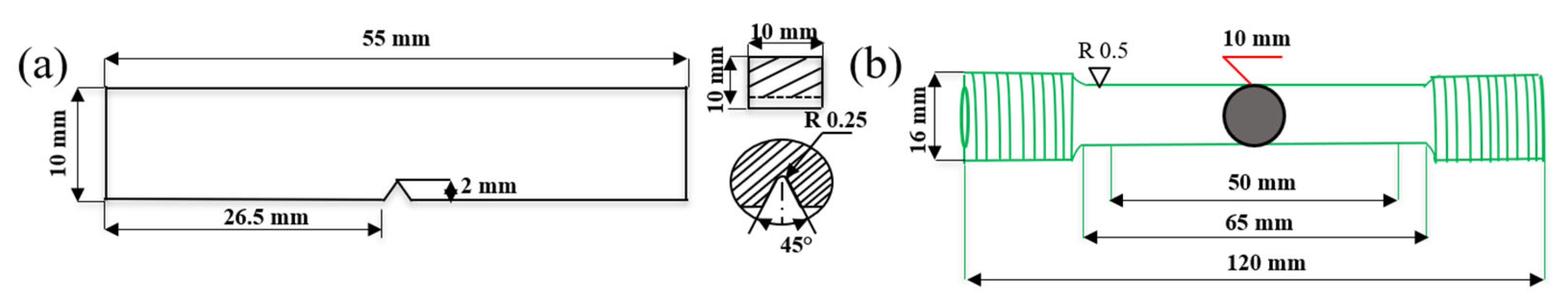 - GB/T 229.1-2020; Metallic Materials—Charpy Pendulum Impact Test—Part 1: Test Methods. China Standards Press: Beijing, China, 2020.
