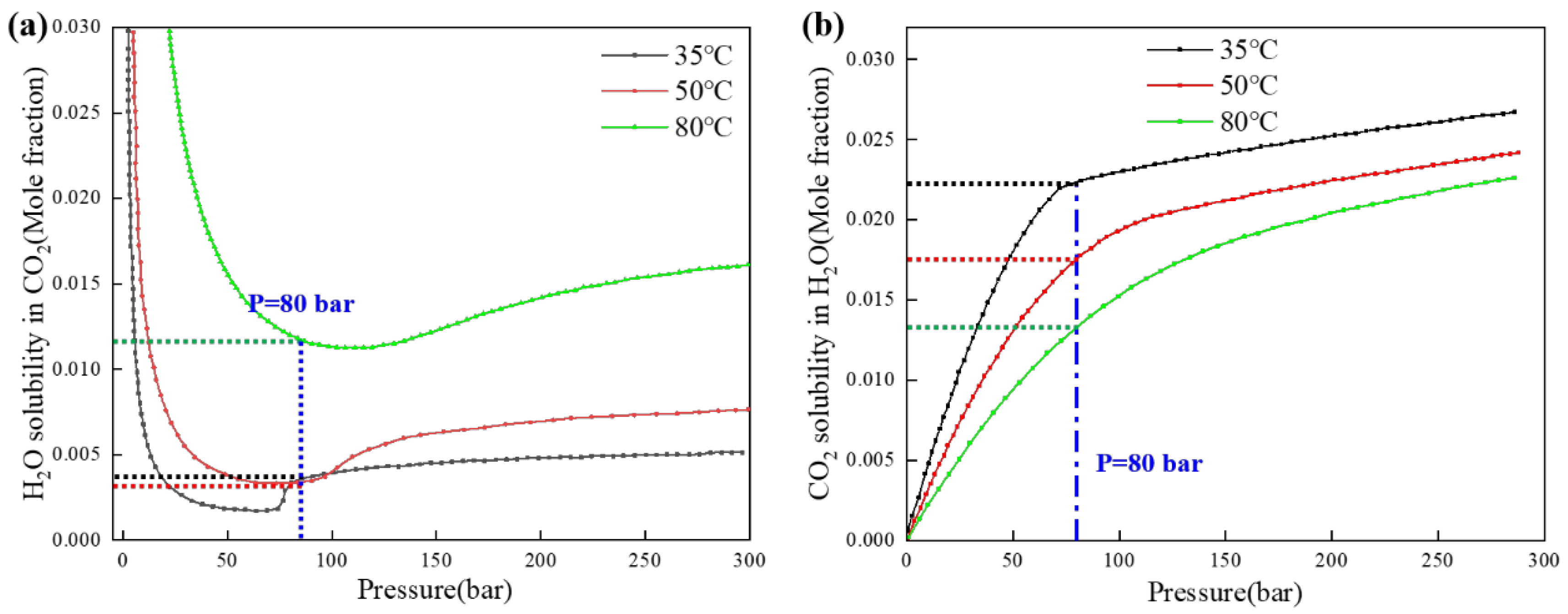 - Mass transport implications: 1: Despite similar molar solubilities at 35 °C and 50 °C, the volumetric H2O concentration in the CO2 phase exhibits strong temperature dependence; 2: Demonstrates a 38.4% reduction in dissolved H2O mass per unit volume despite only a 5.4% decrease in molar fraction.
