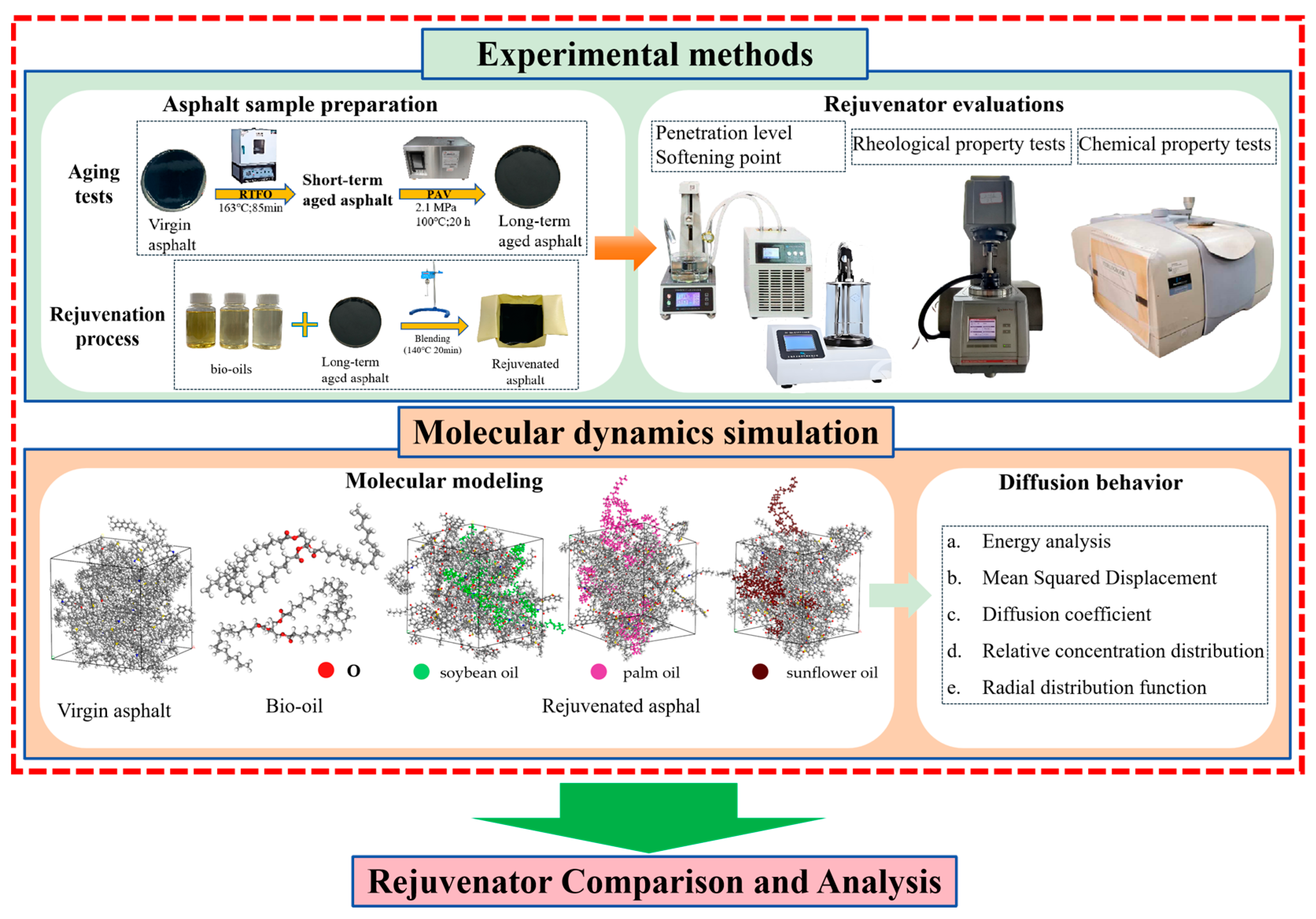 - Li, B.; Han, J.; Wei, D.; Ji, H.; Yao, T.; Wang, H.; Han, J.; Zhang, Y. A molecular dynamics simulation study on the recovery performance of aged asphalt binder by waste vegetable oil rejuvenators. J. Clean. Prod. 2024, 442, 140796. [Google Scholar] [CrossRef]