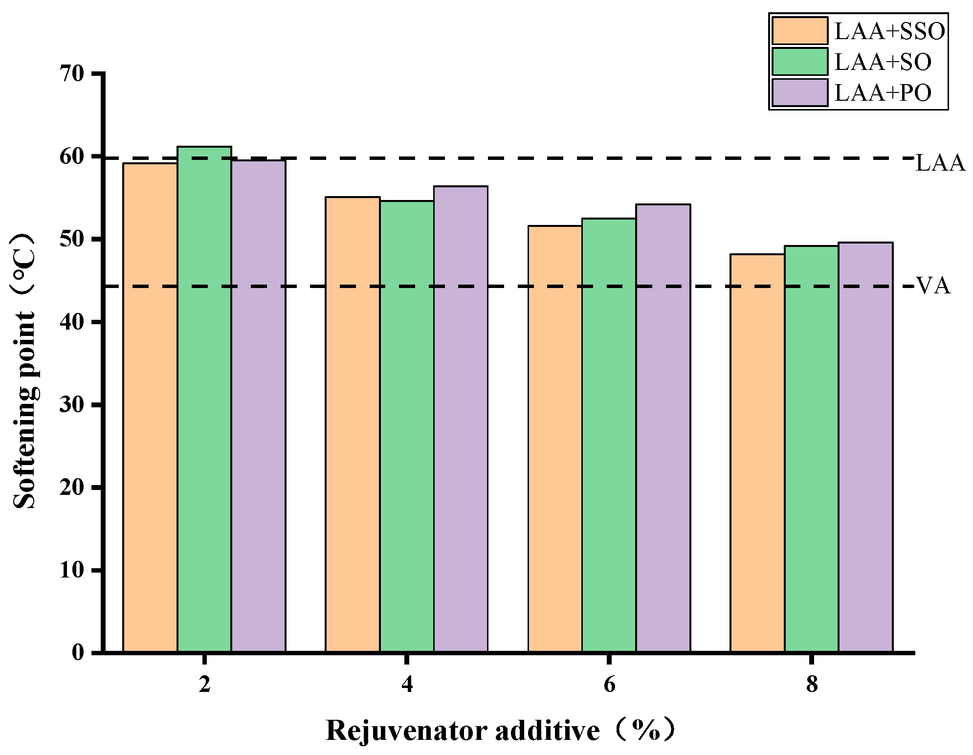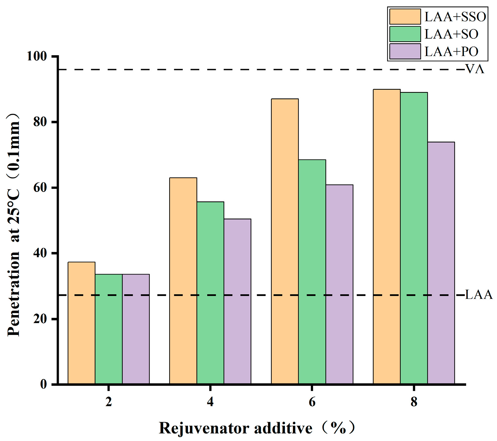 - Asphalt physical property tests show that aging raises softening point and markedly lowers penetration. Bio-oil helps both recover, with better effects at higher dosages. The three bio-oils perform similarly in reducing softening point, but SSO and SO outperform PO in improving penetration. At 8% content, aged asphalt’s properties mostly recover to near-original levels, so 8% is the optimal dosage.