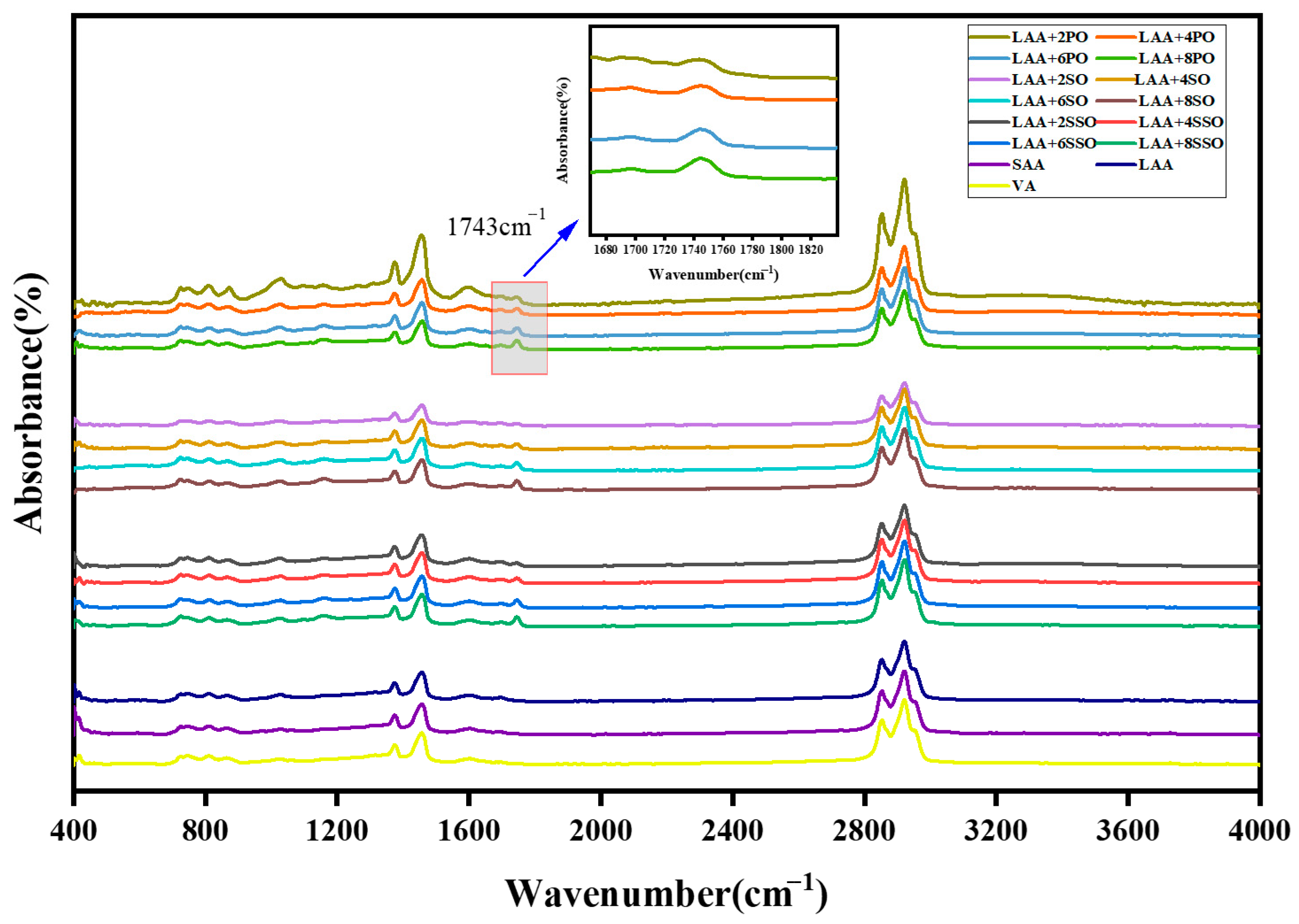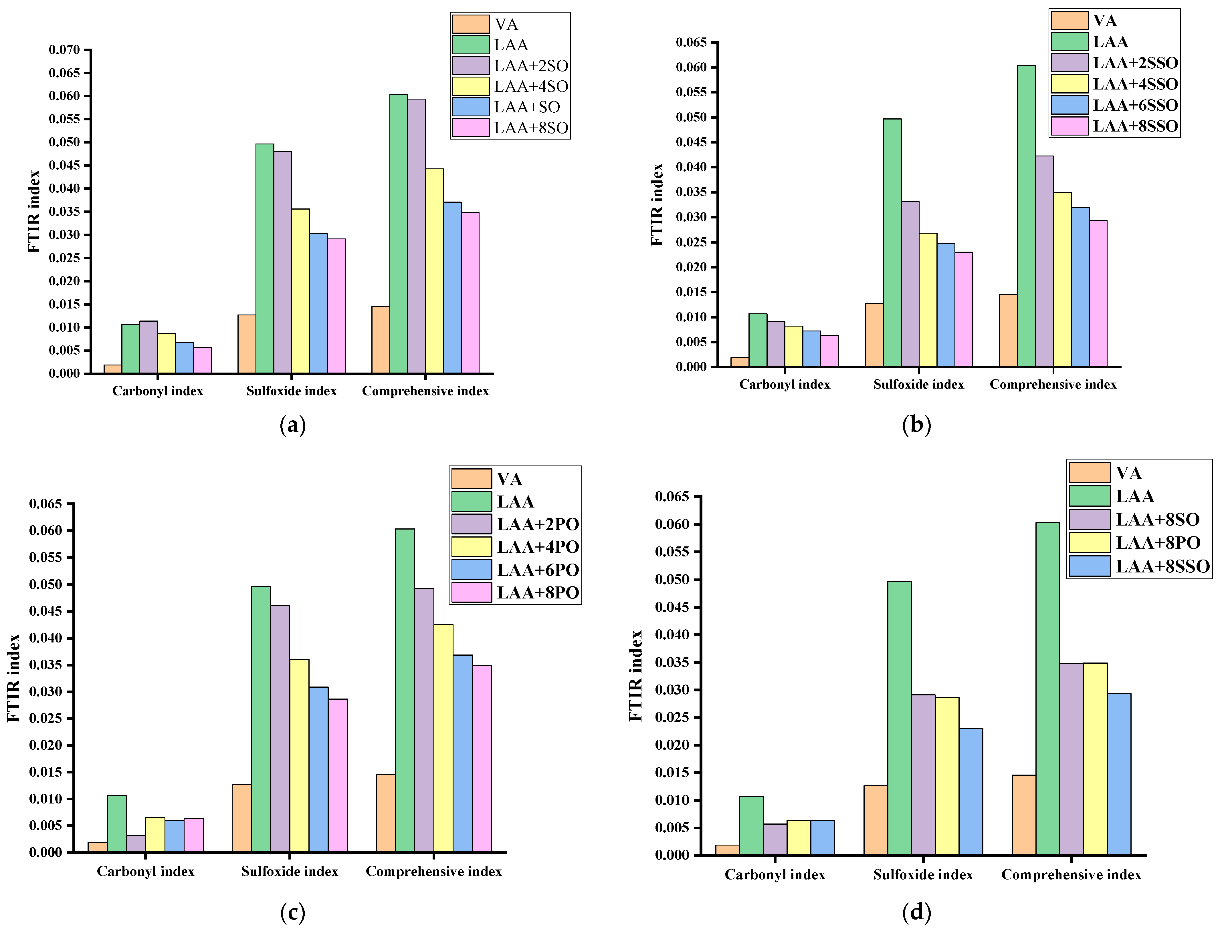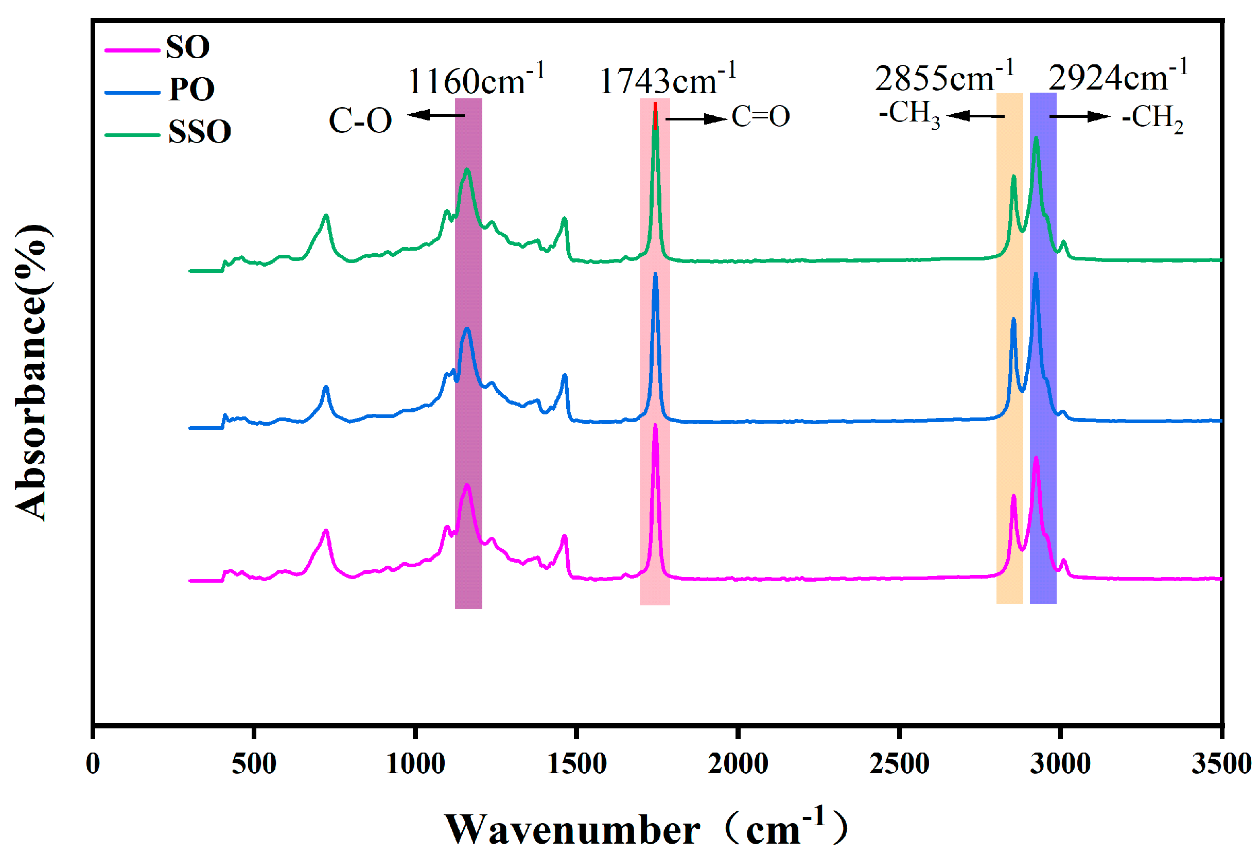 - The FTIR results show that the carbonyl index and sulfoxide index of aged asphalt decrease with the increase in the addition amount of the three bio-oils, indicating that the three bio-oils can improve the impact of aging on asphalt. In addition, at the optimal dosage, the regeneration efficiency of bio-oils on the chemical components of aged asphalt decreases in the order of SSO → SO → PO. The difference in regeneration effect between SO and PO is not significant, while SSO shows the best functional group repair ability.