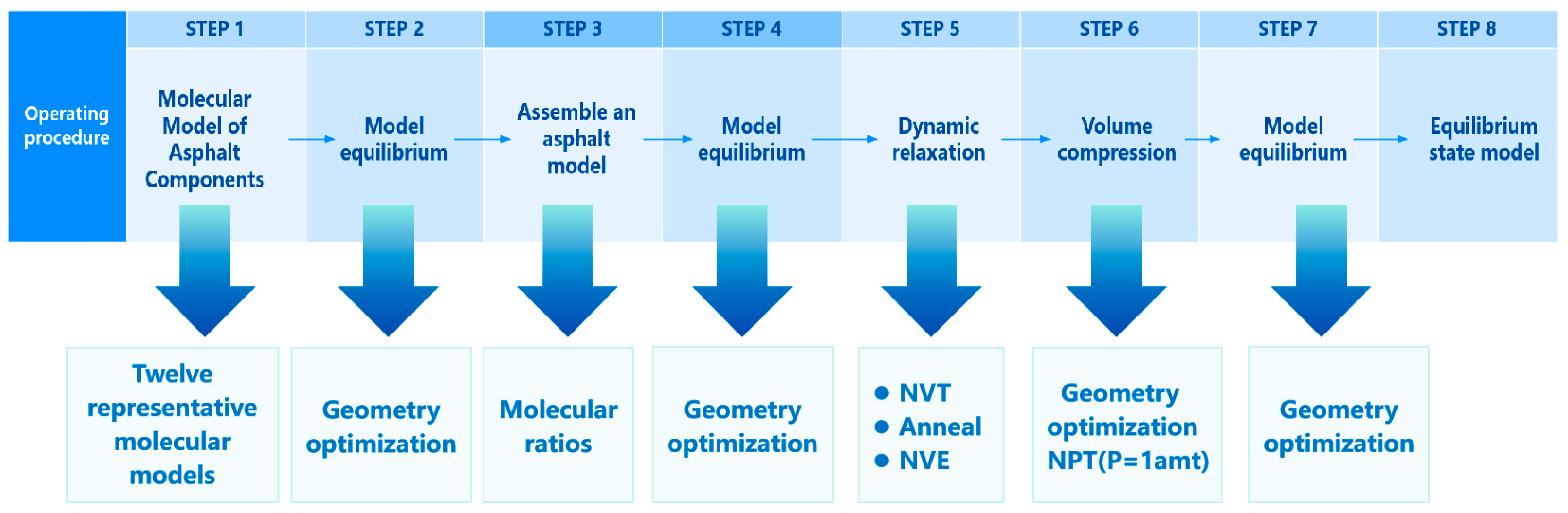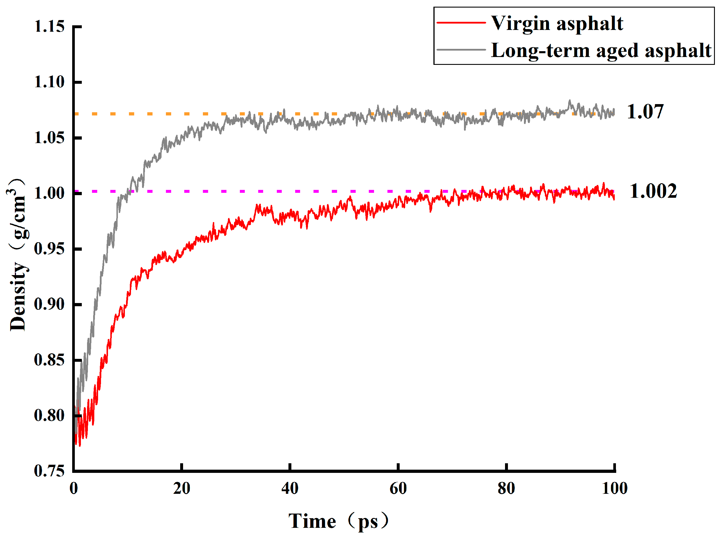 - In this paper, molecular models of virgin asphalt, aged asphalt, bio-oil, and rejuvenated asphalt were established through molecular dynamics (MD). The density and solubility parameters of the virgin asphalt were obtained by MD. The simulation test results are consistent with the existing results, indicating the correctness of the established asphalt molecular model.