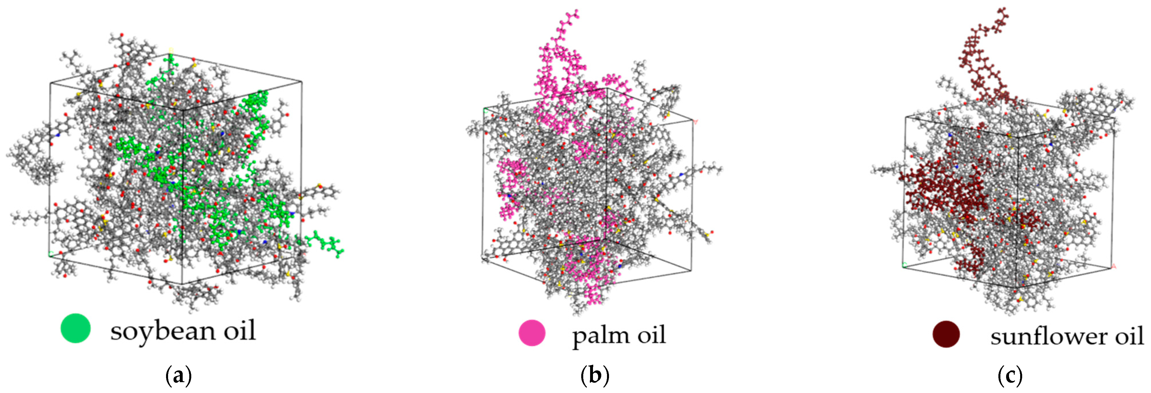 - Shi, K.; Ma, F.; Fu, Z.; Liu, J.; Song, R.; Yuan, D.; Tang, Y. Molecular dynamics simulation insights into rejuvenating aged asphalt with waste soybean oil and polymers. Constr. Build. Mater. 2024, 439, 137260. [Google Scholar] [CrossRef]