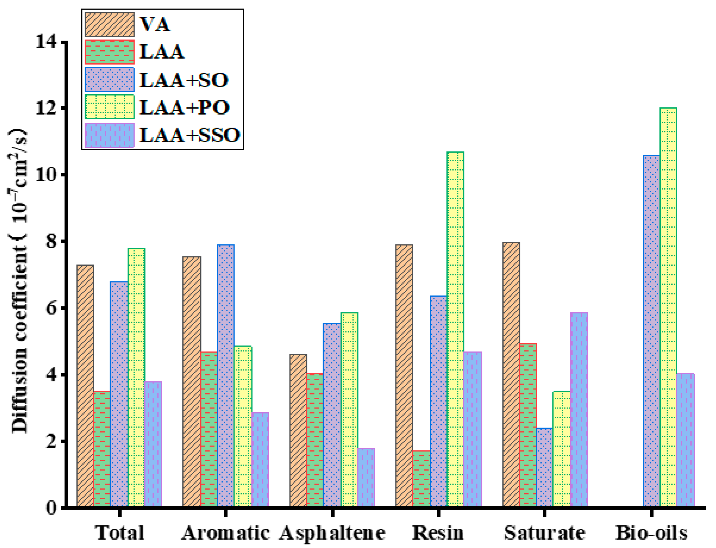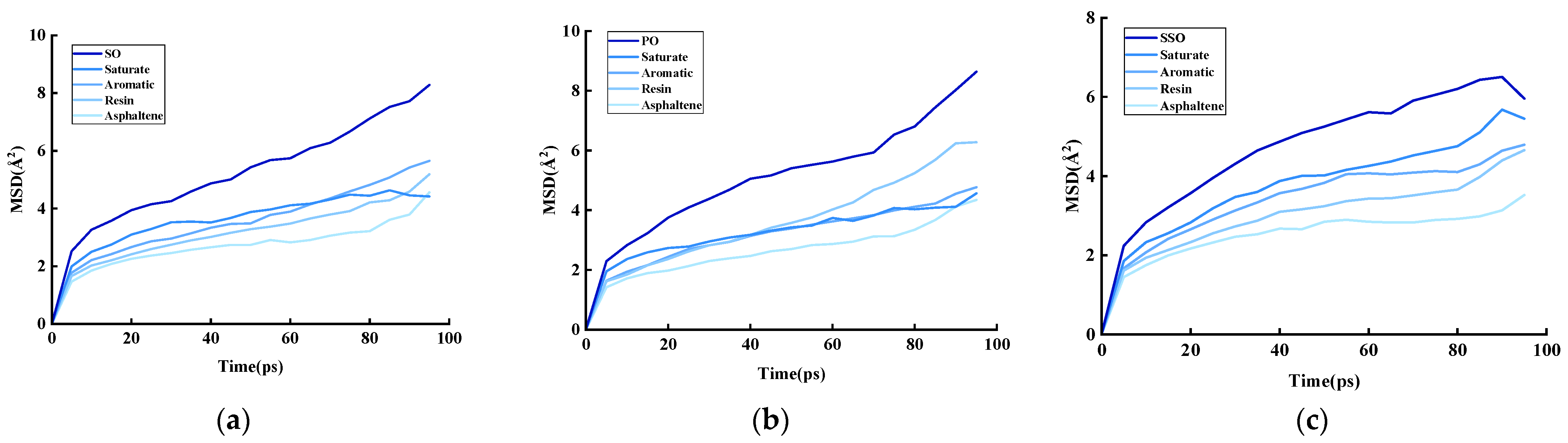 - The diffusion behavior analysis of three types of rejuvenated asphalts, LAA+SO, LAA+PO, and LAA+SSO, was studied through molecular dynamics simulation. By comparing the MSD values of the three rejuvenators, it can be found that the diffusion effects of soybean oil and palm oil are better than those of sunflower oil. Soybean oil and palm oil can effectively improve the performance of aged asphalt and enhance its diffusion ability in various components.