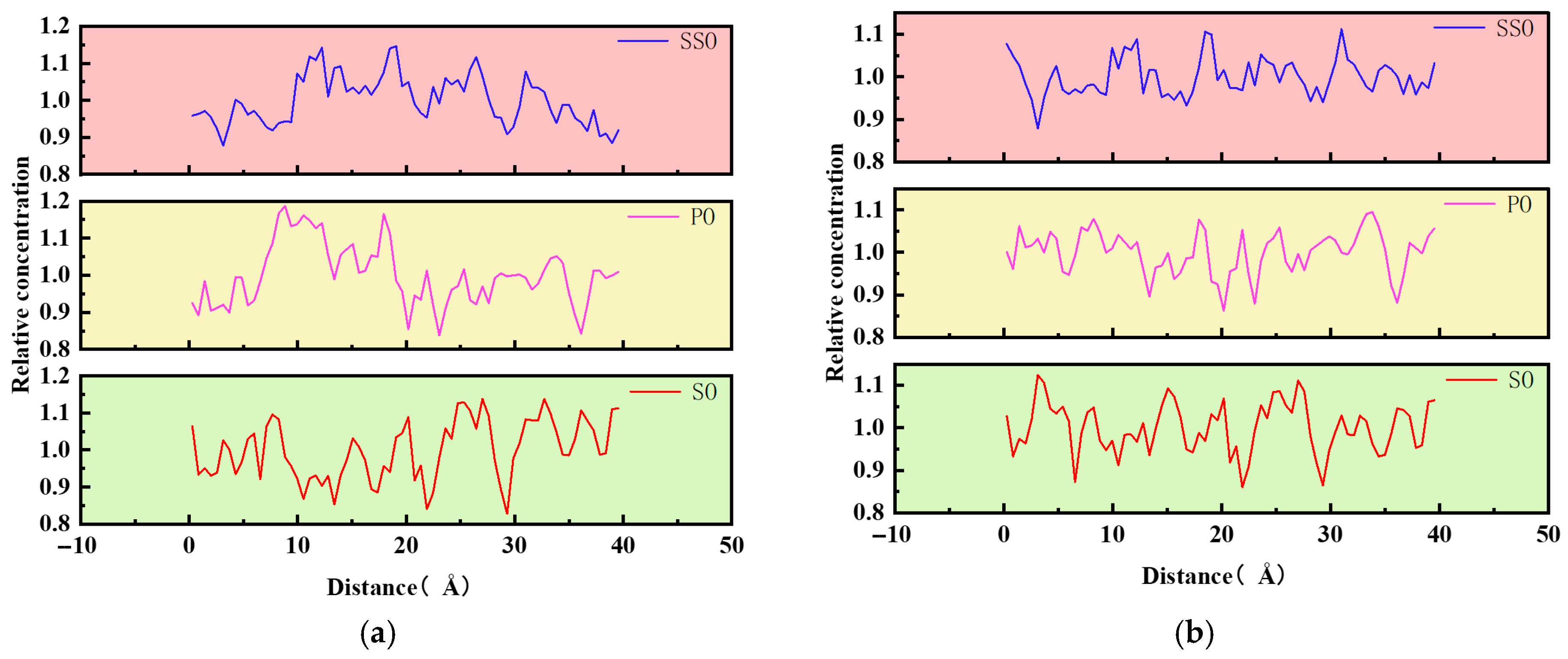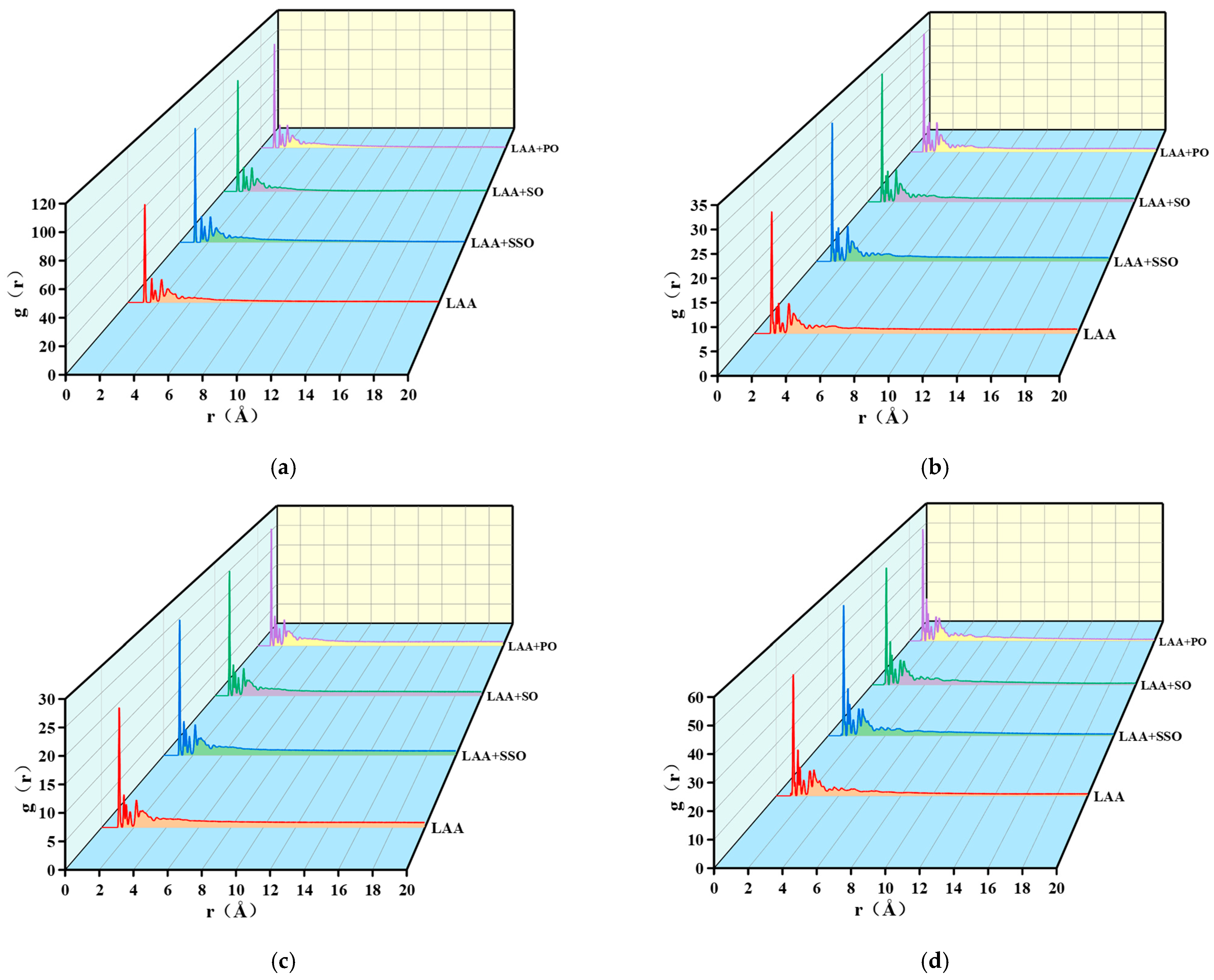 - Through the RDF simulation of the four components of asphalt, it was found that compared with sunflower oil, the g(r) peaks of each component in the rejuvenated asphalts with soybean oil and palm oil are higher, and the packing density of the asphalt molecular model is greater. This indicates that the orderliness of asphalt molecules is enhanced, and also demonstrates that there is good compatibility between soybean oil, palm oil, and asphalt.