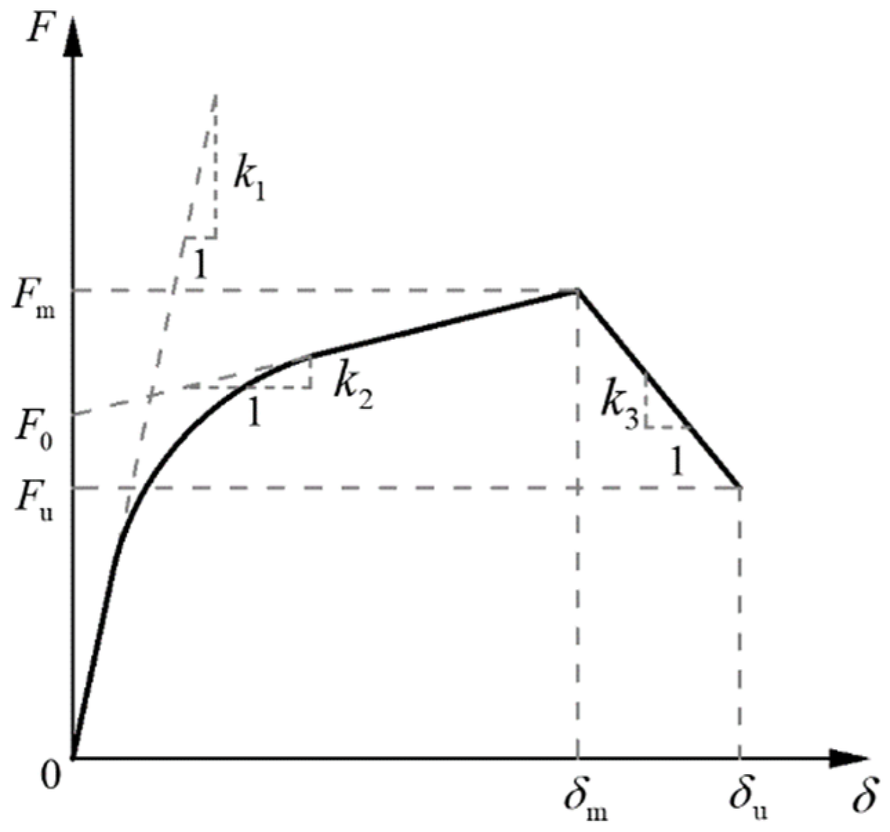 | Control Parameters | K1 (kN/mm2) | K2 (kN/mm2) | K3 (kN/mm2) | F0 (kN) | δm (mm) | δu (mm) |