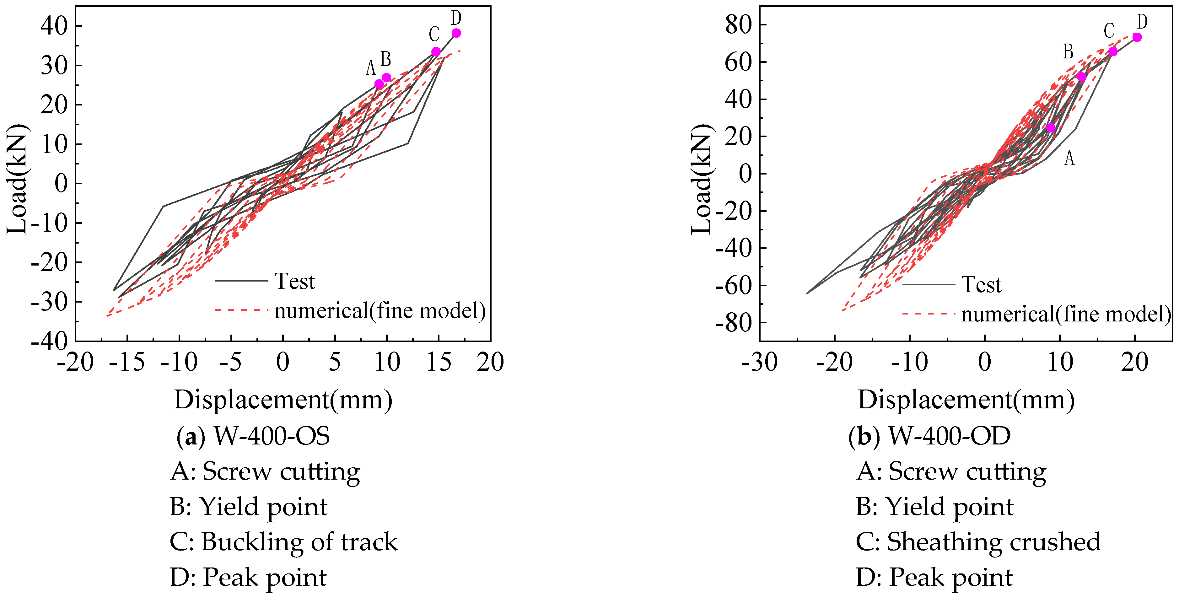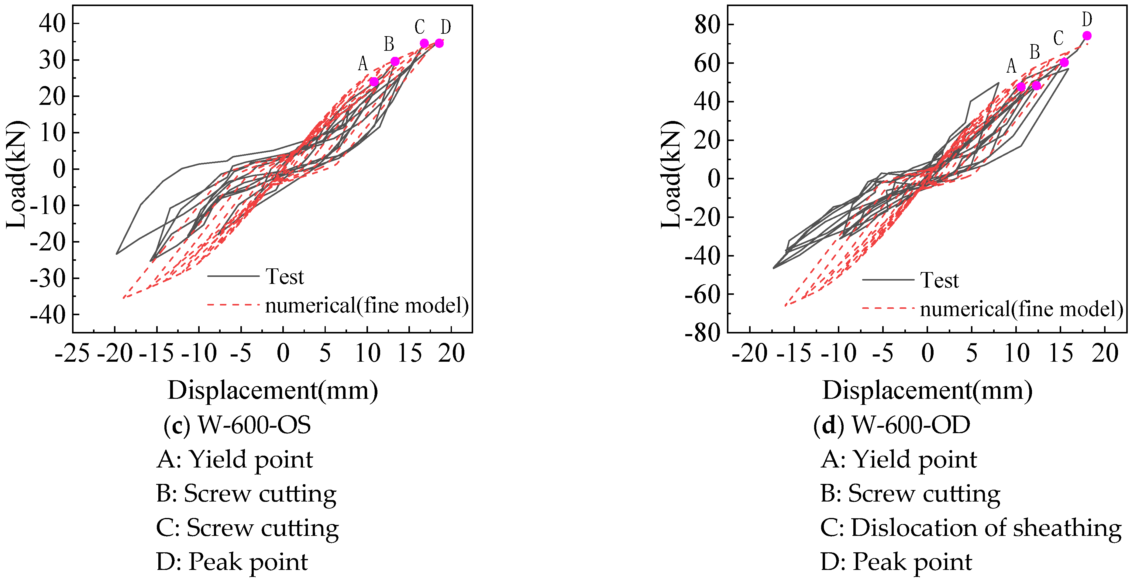- Both the fine model with screw connection details and the simplified model using the equivalent spring method established in this paper can well simulate the deformation of the modular CFS shear wall under lateral low cyclic loading, reflecting the same characteristics of the pinch effect. The yield and peak load, as well as yield and peak displacement, calculated by the two models are in good agreement with the test. Although the calculation accuracy of the simplified model is slightly lower than that of the fine model, it greatly simplifies the calculation and is more suitable for the subsequent analysis of multi-story building structures.