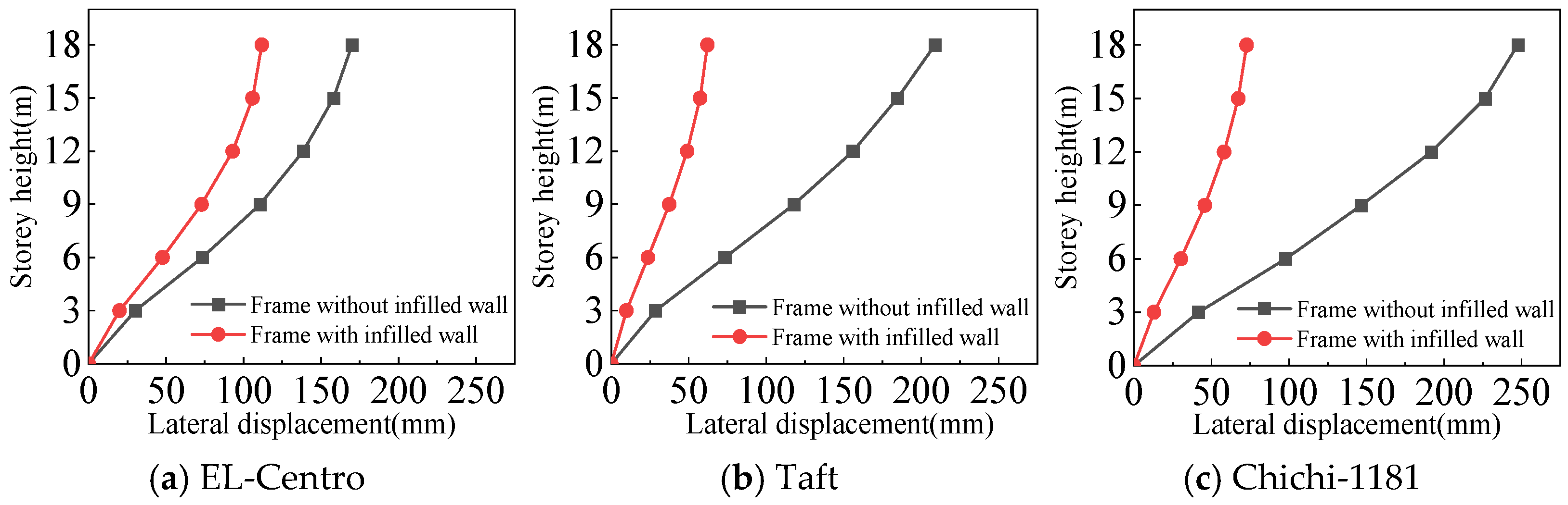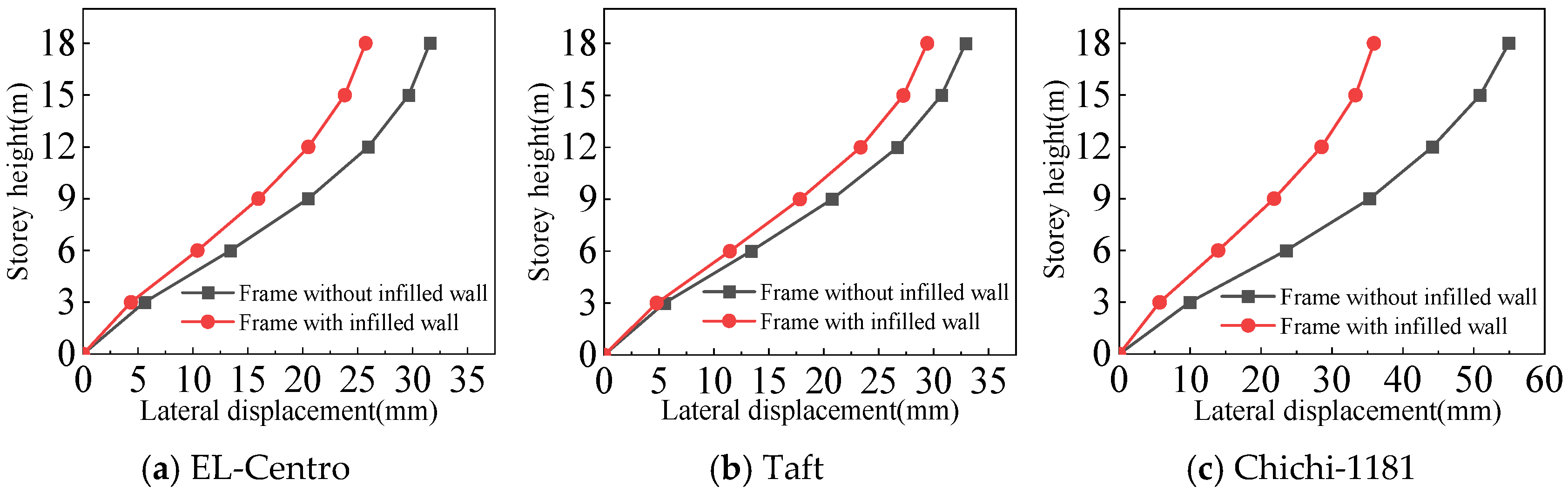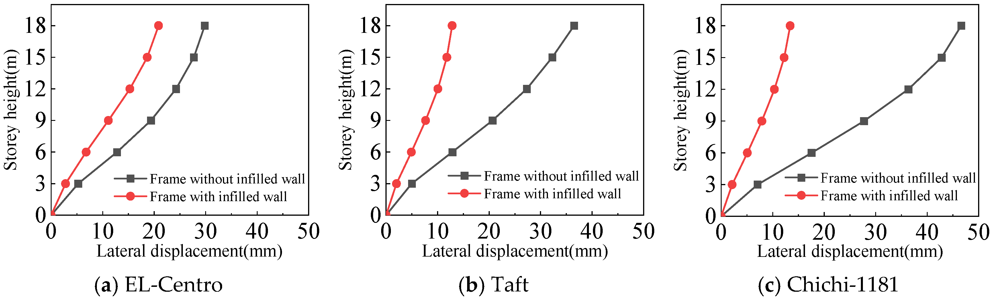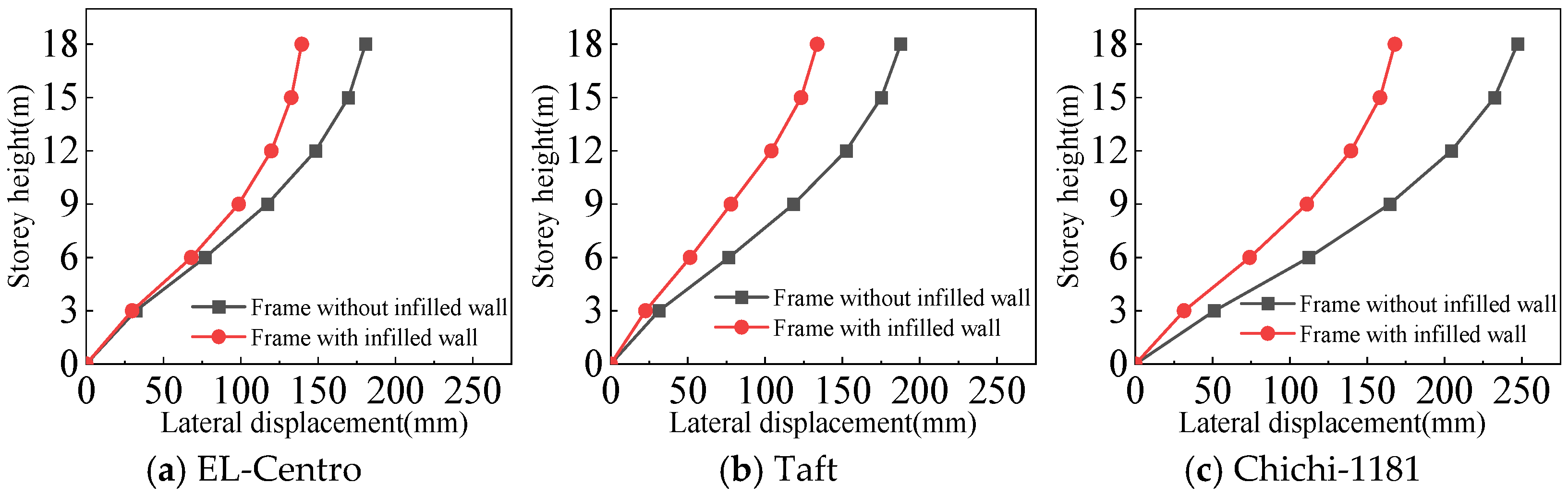 - Both the frame with infilled wall and frame without infilled wall show shear-type deformation under all three seismic wave time history analyses. Horizontal lateral displacement increases with increasing earthquake intensity for both frames. In the same situation, the lateral displacement of each floor of the frame with infilled wall is always smaller than that of the frame without infilled wall. Comparisons show that the maximum lateral displacements of the top floor of the frame with infilled wall are 11–71% lower than those of the frame without infilled wall, which indicates that the infilled wall increases the horizontal lateral stiffness of the structure.