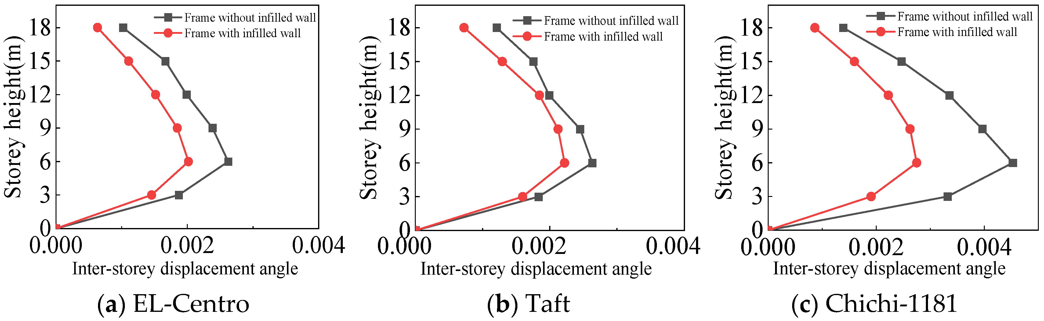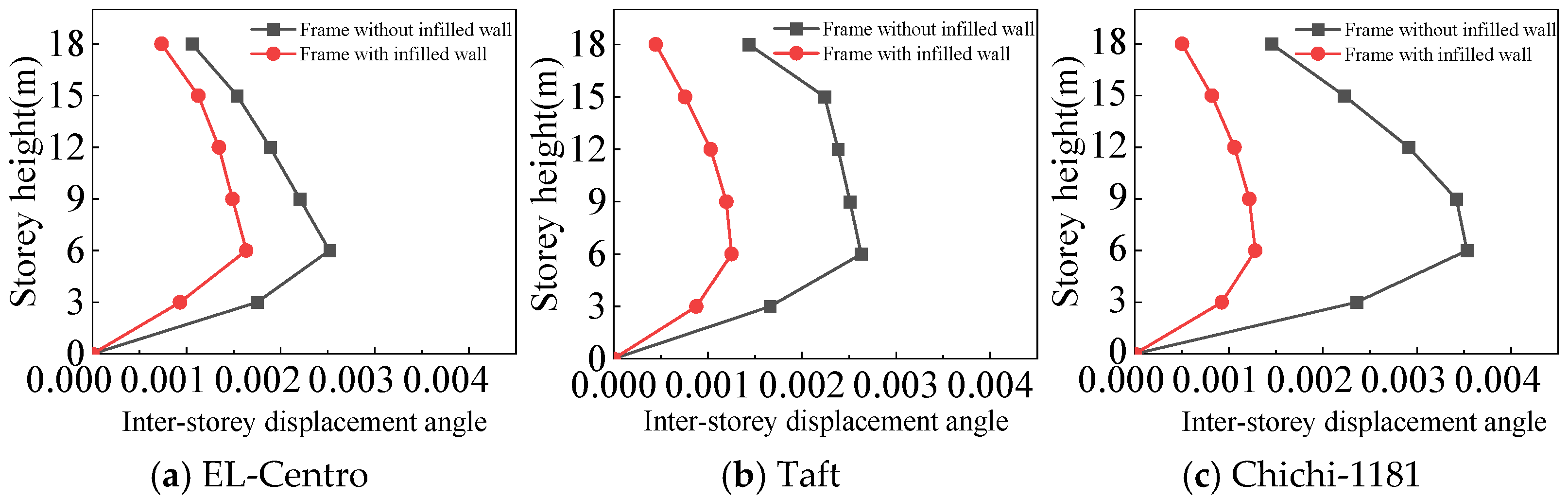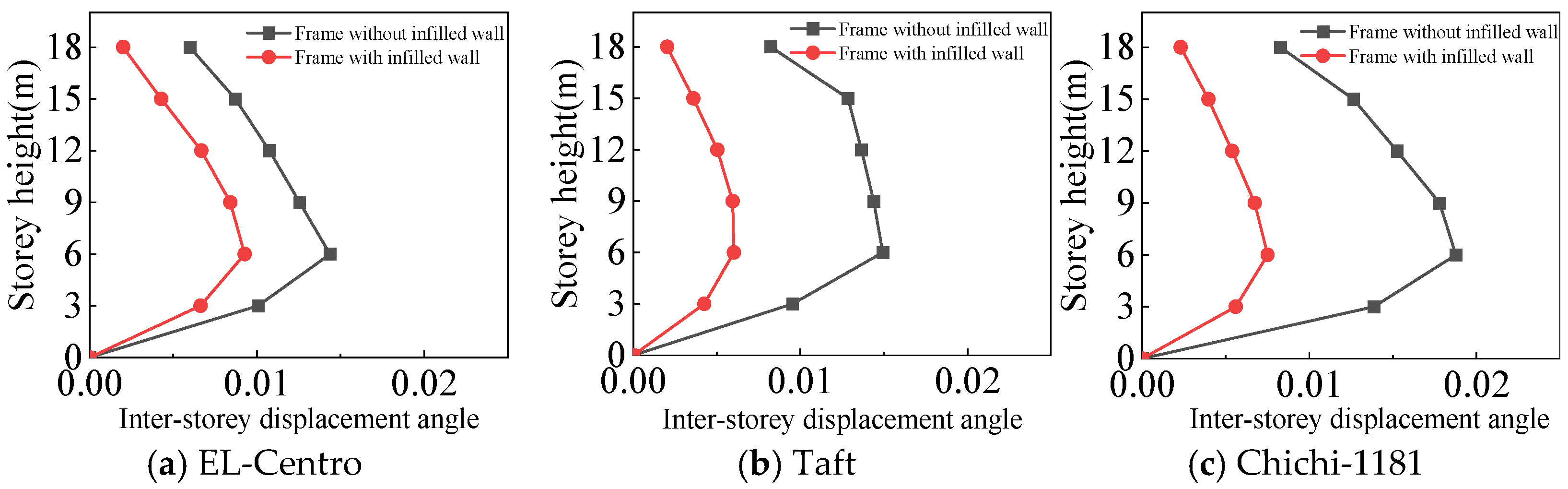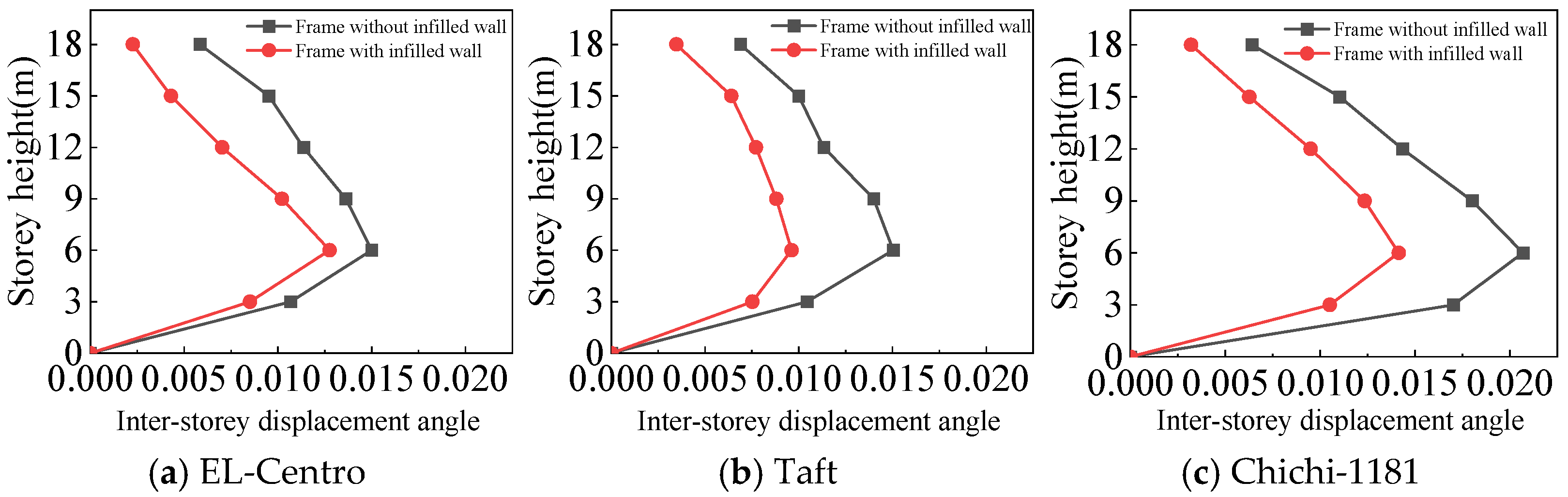 - The inter-story displacement angle of the frame with infilled wall under the same situation is smaller than that of the frame without infilled wall. The maximum inter-story displacement angle of the frame with infilled wall is 15–67% lower than that of the frame without infilled wall.
