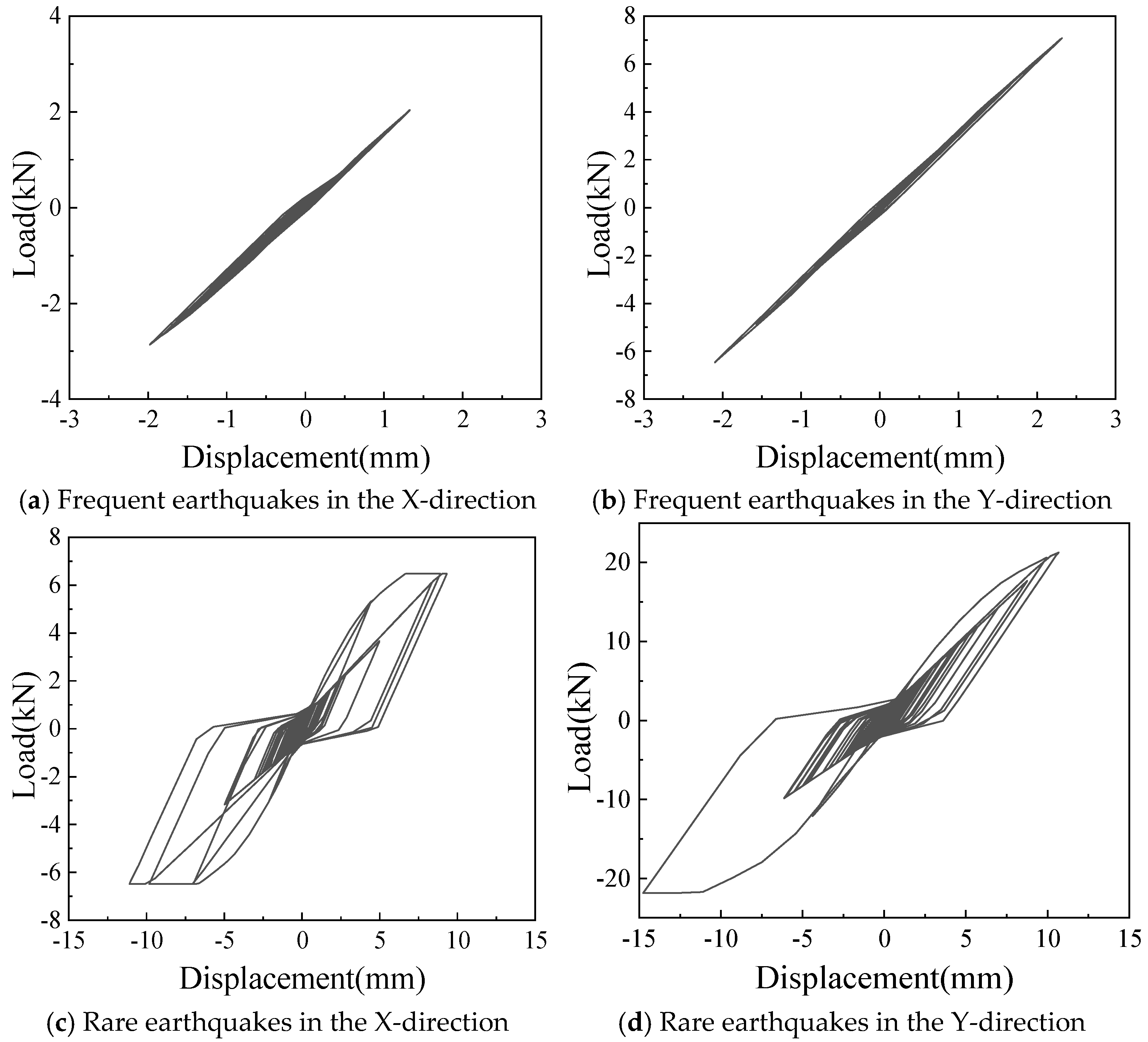 - For the frame with infilled wall, because the doors and windows are set in the X-direction, the stiffness of the X-direction of the model is lower. The lateral displacement of the top floor in the X-direction is greater than that in the Y-direction under frequent and rare earthquakes. This corresponds to the fact that the X-direction translational natural vibration period from the structural modal analysis is greater than that in the Y-direction.