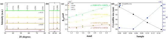 (a) XRD patterns of (1 − x)BNTNb-xSBTA ceramics with different compositions, (b) Magnified views of the (111) and (200) characteristic peaks, (c) Williamson-Hall plots of βcosθ versus 4sinθ for (1 − x)BNTNb-xSBTA ceramics with varying SBTA content (x = 0, 0.05, 0.1, 0.15), (d) Compositional dependence of crystallite size (black squares, left axis) and lattice microstrain (blue circles, right axis) extracted from Williamson-Hall analysis for (1 − x)BNTNb-xSBTA ceramics.