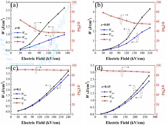 (a–d) Variations in recoverable energy density (Wrec), total energy density (Wtot), and energy efficiency (η) with electric field strength for (1 − x)BNTNb-xSBTA ceramics at room temperature.