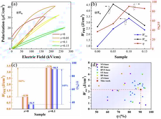 To quantify the compositional optimization of energy storage performance under maximum applied fields, Figure 8a–d summarizes the unipolar P-E hysteresis loops and key metrics for (1 − x)BNTNb-xSBTA ceramics evaluated at their respective breakdown strengths, with detailed numerical results presented in Table 2. As shown in Figure 8a, the loops narrow progressively with increasing SBTA content, reflecting diminished hysteresis due to the transition from long-range ferroelectric domains to dynamic PNRs, which suppress remnant polarization and enhance the polarization difference. The composition-dependent trends (Figure 8b and Table 2) reveal that energy storage performance initially rises with x before peaking at x = 0.10, where the balanced local disorder, grain refinement, and defect suppression minimize energy loss while maximizing recoverable energy density and efficiency. Figure 8c highlights the substantial enhancements relative to the undoped sample, with the x = 0.10 composition exhibiting a 243% increase in Wrec and 145% improvement in η, underscoring the efficacy of SBTA doping in promoting relaxor behavior and insulation. For contextual benchmarking, Figure 8d compares the performance of this work with reported lead-free ceramics across BNT-, ST-, NN-, and AN-based systems, demonstrating that the x = 0.10 composition outperforms the majority of prior studies, particularly in achieving high efficiency under moderate fields, attributable to the synergistic nanoscale heterogeneity and microstructural tailoring that yield slim P-E loops and robust breakdown strength. Specifically, the superior performance relative to other BNT-based ceramics can be attributed to its refined grain structure and the effective suppression of deleterious defects. The pronounced grain refinement achieved in this composition yields a higher density of grain boundaries, which act as insulating barriers that scatter charge carriers and inhibit domain wall motion. This microstructural feature elevates the overall insulation resistance and helps maintain slim hysteresis loops by limiting extrinsic energy losses. Concurrently, the aliovalent co-doping with Ta5+ and Al3+ minimizes oxygen vacancy formation through internal charge compensation, thereby reducing defect-induced leakage currents. The lower concentration of oxygen vacancies bolsters the breakdown strength and ensures that high efficiency is retained under moderate electric fields. Together, these structural (grain boundary engineering) and electrical (defect mitigation) mechanisms synergistically explain why the x = 0.10 composition outperforms conventional BNT-based systems in energy storage efficiency and reliability.