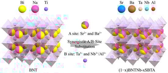 Schematic representation of the crystal structures illustrating synergistic A-site and B-site substitution in the (1 − x)BNTNb-xSBTA solid solution system.