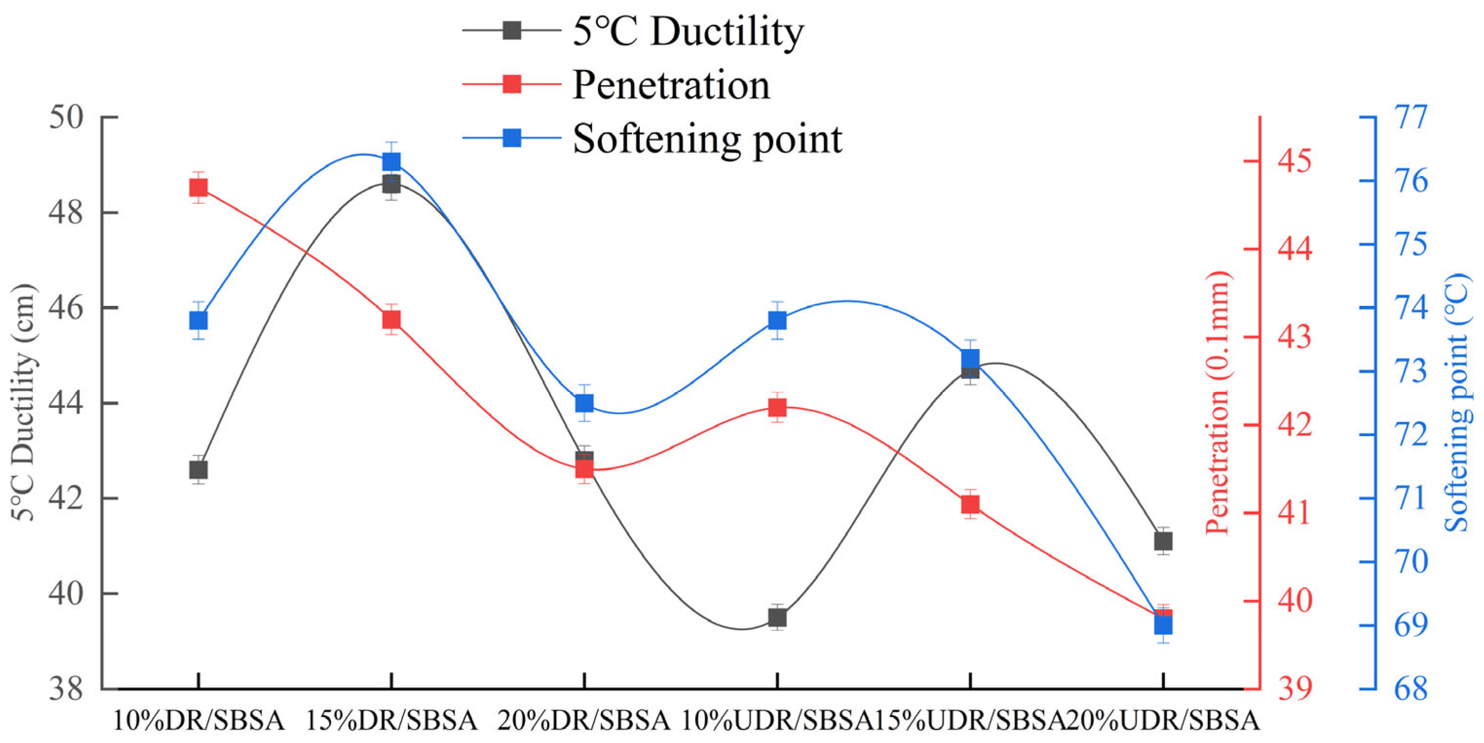 Preparation of UDR/SBSA: The base asphalt was heated to 145 °C. Undevulcanized rubber powder at 10%, 15%, and 20% by weight was added, and the mixture was thoroughly mixed for approximately 5 min to ensure uniform dispersion of the rubber powder in the base asphalt. Under 4000 rpm and 170–175 °C, 4% SBS was added, and the mixture was sheared for approximately 40 min by a high-speed emulsifying shear mixer (Shanghai Aido BME100LT). Then, 0.3% stabilizer was added, stirred for 1 min, and cured at 175 °C for 1 h.