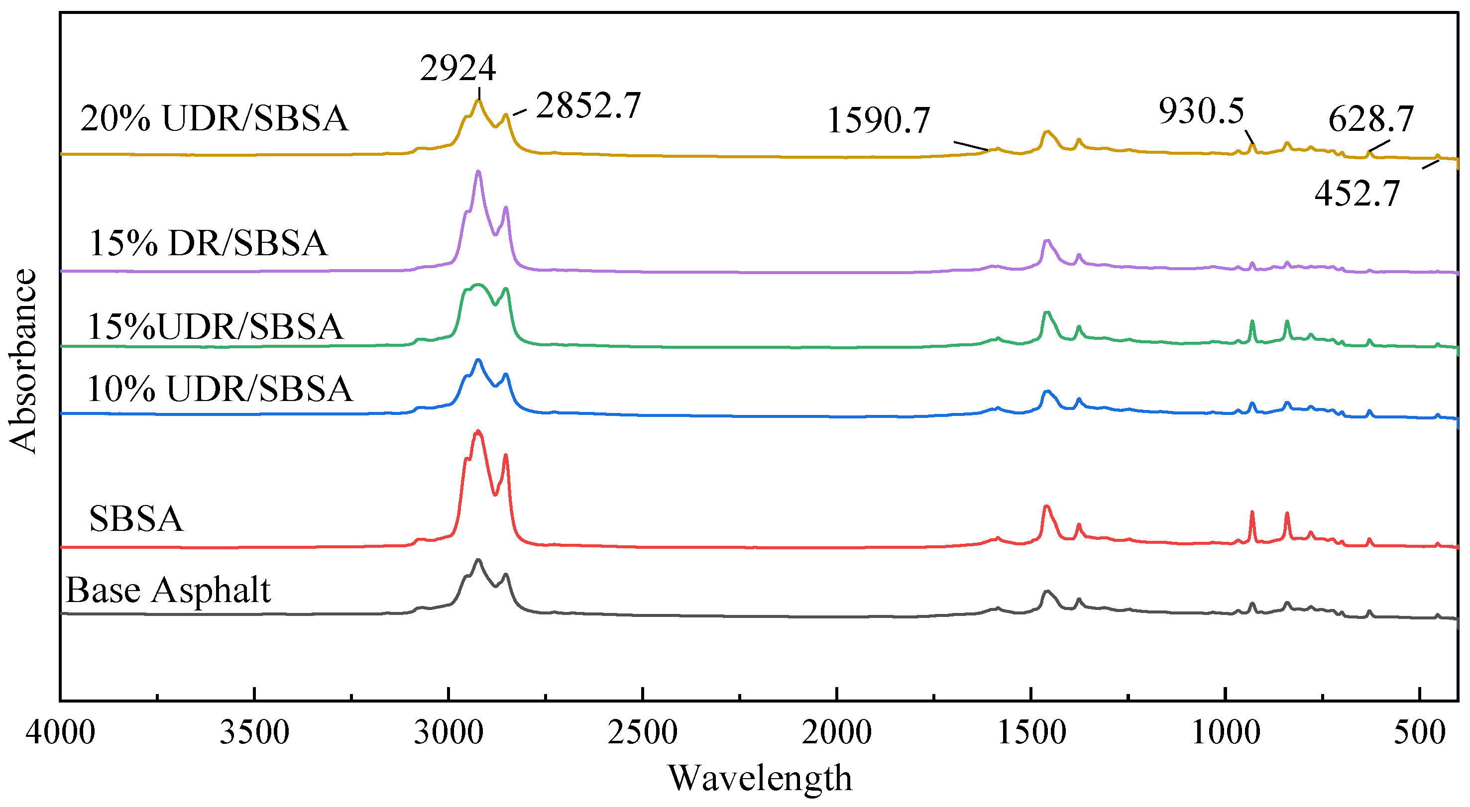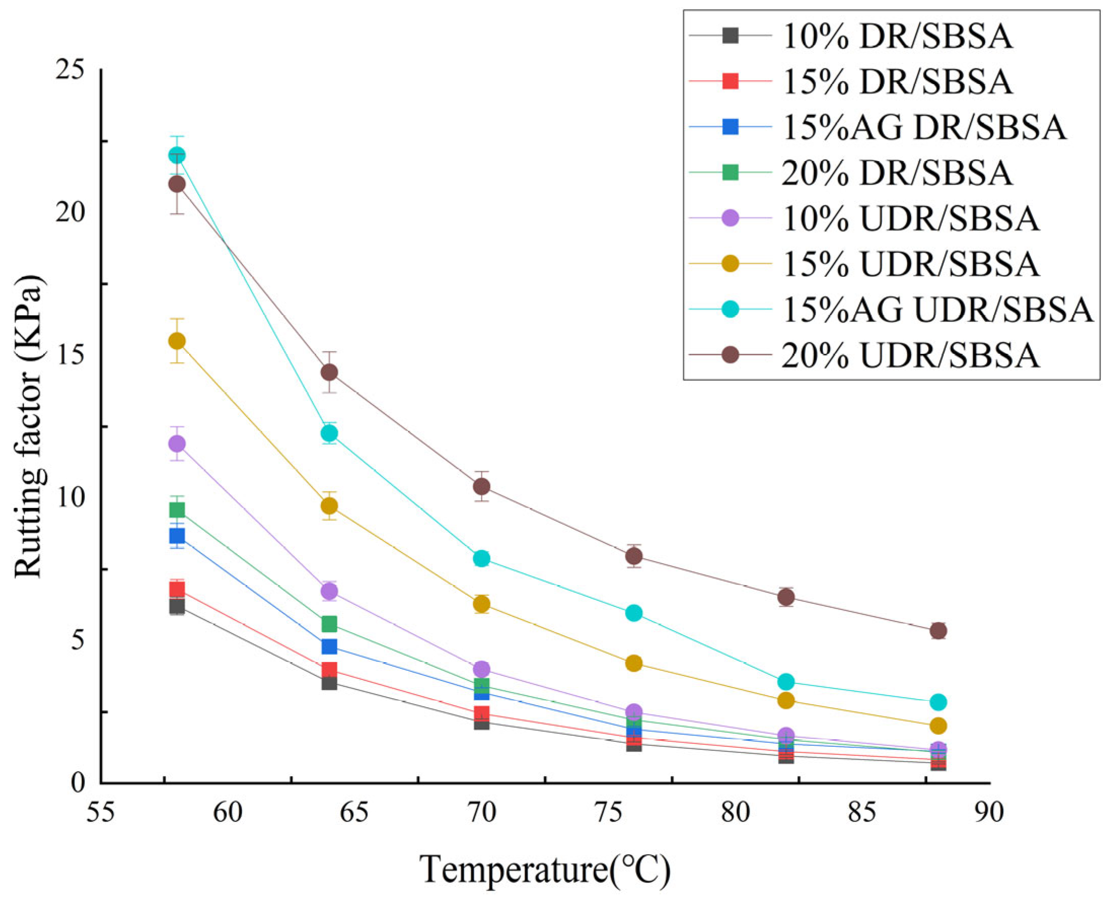 Desulfurized rubber powder is abbreviated as DR, unsulfurized rubber powder is abbreviated as UDR, desulfurized rubber powder/SBS-modified asphalt is abbreviated as DR/SBSA, and unsulfurized rubber powder/SBS-modified asphalt is abbreviated as UDR/SBSA. SBS-modified asphalt is abbreviated as SBSA.