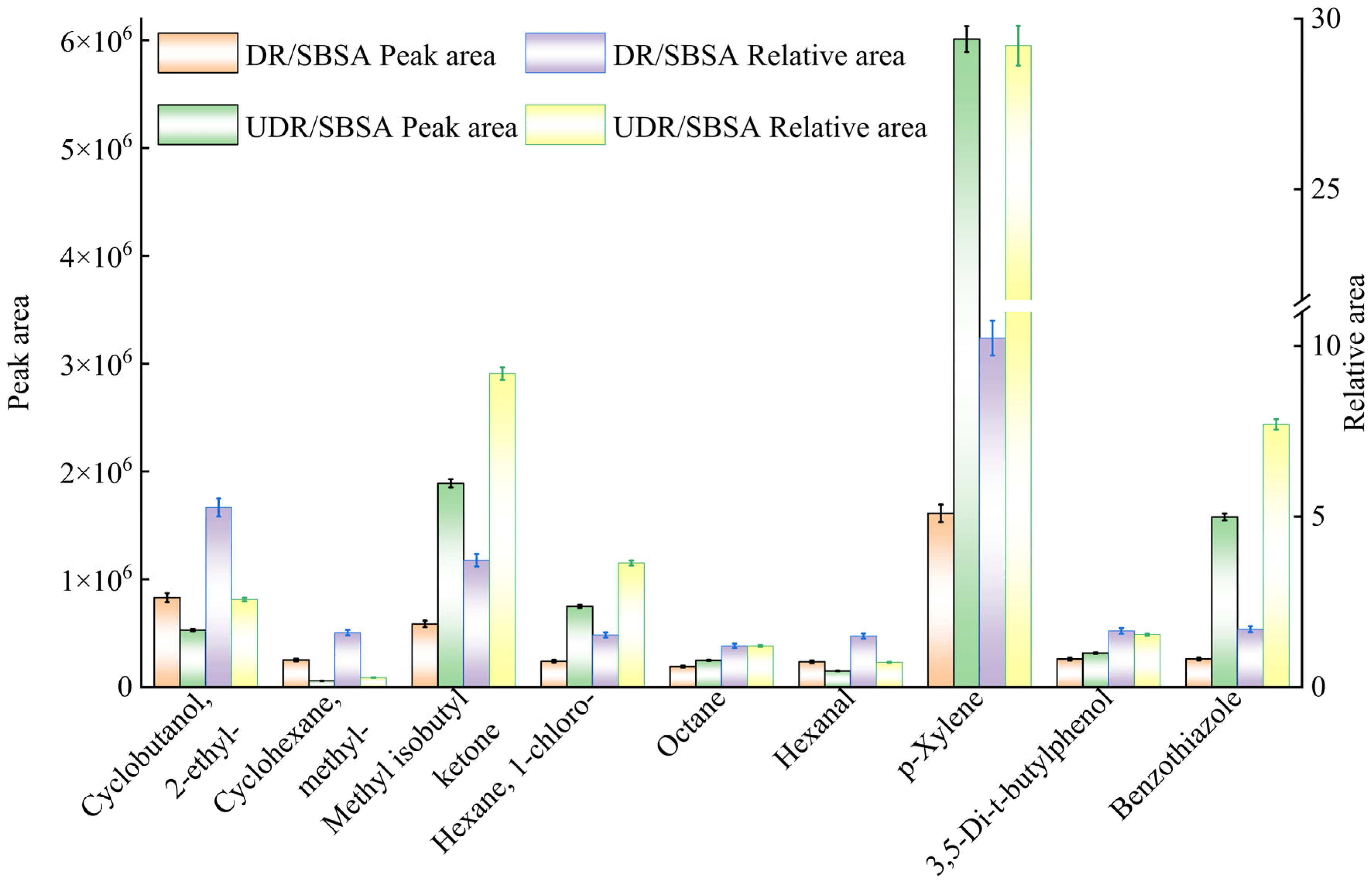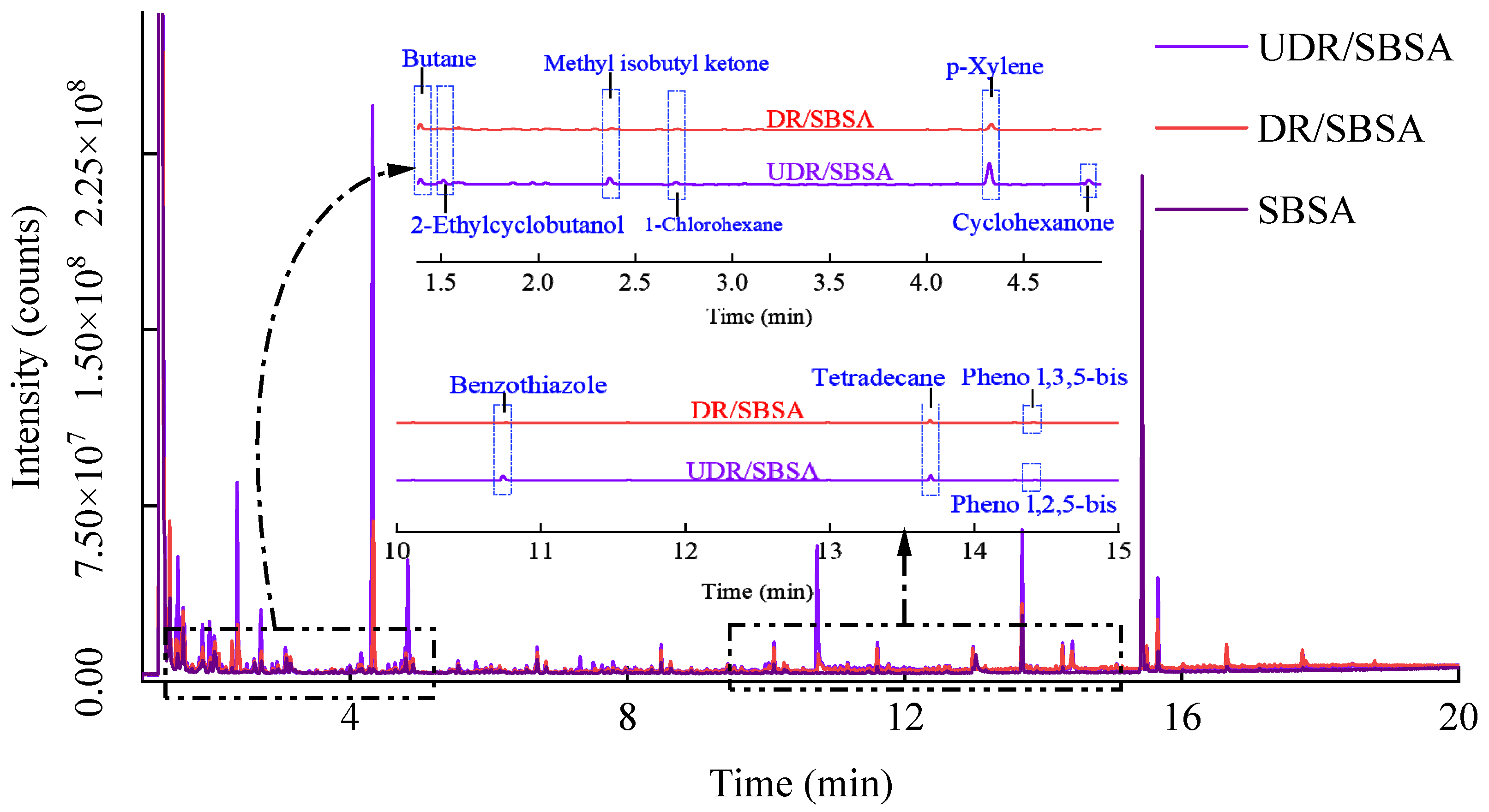 13]. Compared with traditional asphalt, more complex and higher concentrations of VOCs emissions are exhibited by rubber powder/SBS asphalt. The rubber powder in unsulfurized rubber powder/SBS-modified asphalt (UDRA) is mostly derived from waste rubber tires, and the main component of tire rubber is vulcanized polymer. Under high-temperature conditions, sulfur-containing fumes and volatile organic compounds are easily released during the modification process [