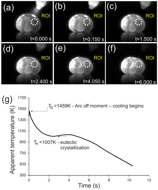 Infrared images of the Fe22Ni16Co19Mn12Cr16P15 alloy ingot after arc extinction, recorded at different times during cooling: (a) t = 0.0 s, (b) t = 0.15 s, (c) t = 1.5 s, (d) t = 2.4 s, (e) t = 4.05 s, (f) t = 6.0 s. Arrows indicate the flattened surface observed as a result of eutectic crystallization. (g) Temperature–time curve recorded in the ROI.