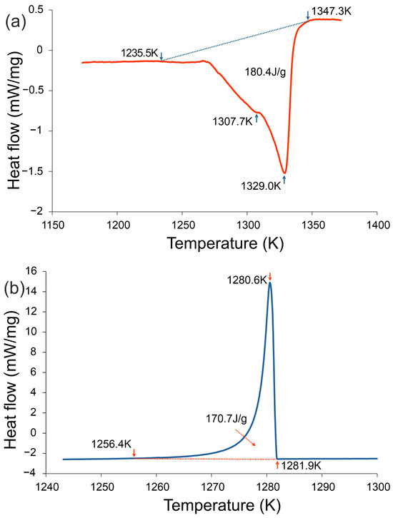 DSC curves of the Fe22Ni16Co19Mn12Cr16P15 alloy recorded at a heating/cooling rate of 20 K·min−1: (a) heating curve and (b) cooling curve. During heating, two endothermic effects were detected, the main one corresponding to melting (1235.5–1347.3 K, enthalpy 180.4 J·g−1). During cooling, a strong exothermic effect appeared in the range 1256.4–1281.9 K, associated with eutectic crystallization (enthalpy −170.7 J·g−1).
