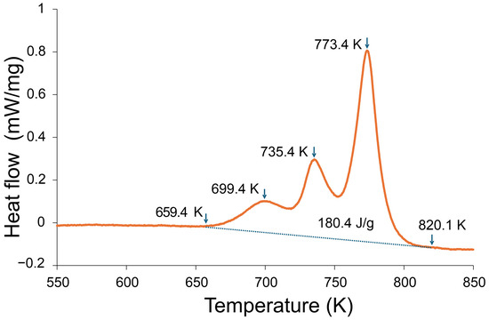 This subsection analyzes the devitrification sequence of the amorphous ribbon (Figure 5), including the three exothermic events and their interpretation.