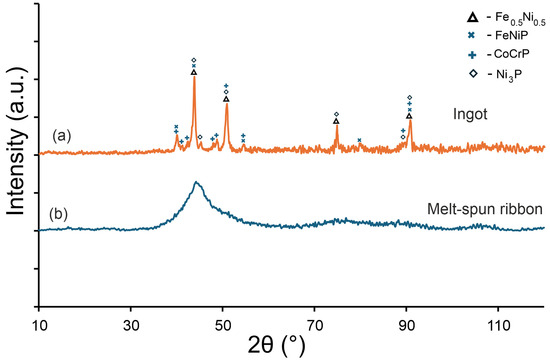 XRD patterns of the Fe22Ni16Co19Mn12Cr16P15 alloy: (a) arc-melted ingot, containing phases isomorphic with Fe–Ni (Fm-3 m), CrCoP (Pnma), Ni3P (I-4), and MnNiP (P-62 m), (b) melt-spun ribbon exhibiting a fully amorphous character.