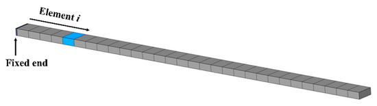 As mentioned in the research procedure section, the relationship among natural frequencies, damage locations, and damage severities (or stiffness reductions) for cantilever beams and WTBs is comprehensively analyzed. Damage is modeled by reducing the stiffness of elements in the target area. The reduction is applied in 2% increments, ranging from 0% to 50%. Damage locations are defined at every node along the blade’s span. Each location consists of a set of elements connected to that node. After obtaining the simulation results, they are validated by comparing them with the analytical model results.
