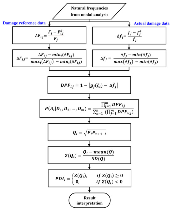 Lastly, the probabilistic damage indicator (PDI) in localizing the damage is calculated as given in Equation (15). The peak of PDI represents the location of damage.