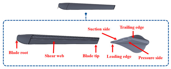 The WTBs are complicated structures designed differently to maximize energy production. Their manufacture utilizes composite materials, including fiberglass and carbon fiber. In existing research, WTBs were modeled using shell elements [54,55] or simplified as beams/one-dimensional (1D) shapes [56]. To approach the real structure, this study proposes a three-dimensional (3D) WTB with solid elements. It is designed based on the NACA4411-63 profile with a 1.2 m length and 0.0026 m thickness. The maximum and minimum chord lengths are 0.16 and 0.087 m, respectively. The considered area of damage creation is on the airfoil section, which is between 0.2 and 1.2 m from the blade root (or is between 0 and 1). The modeled WTB used in this research is shown in Figure 3.